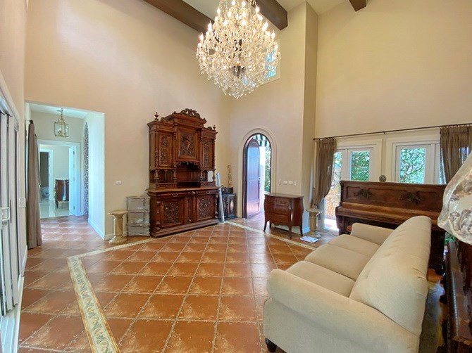Sliding doors open to the covered terrace, garden and private swimming pool