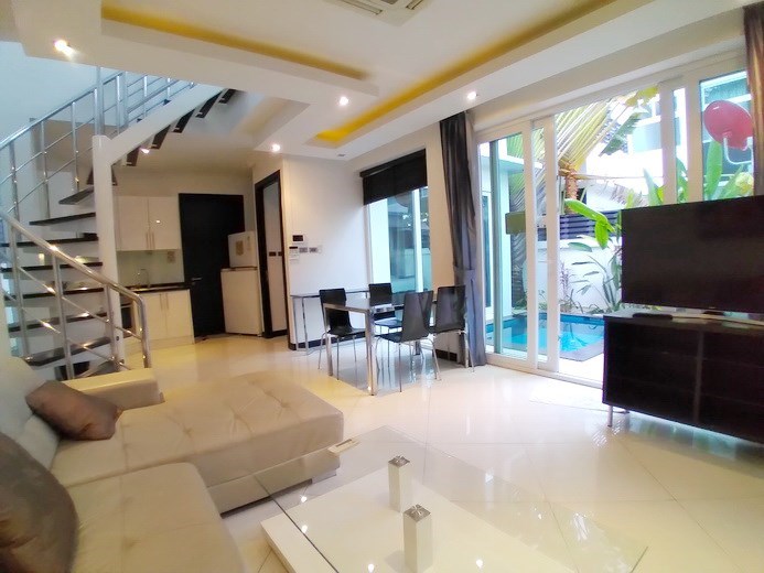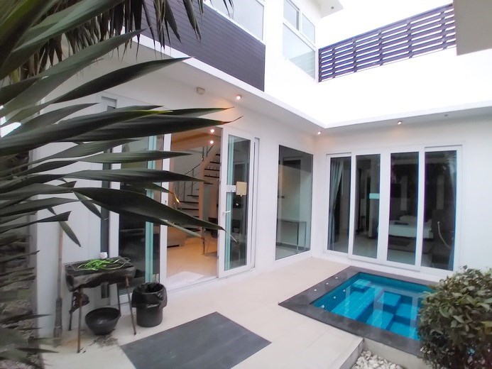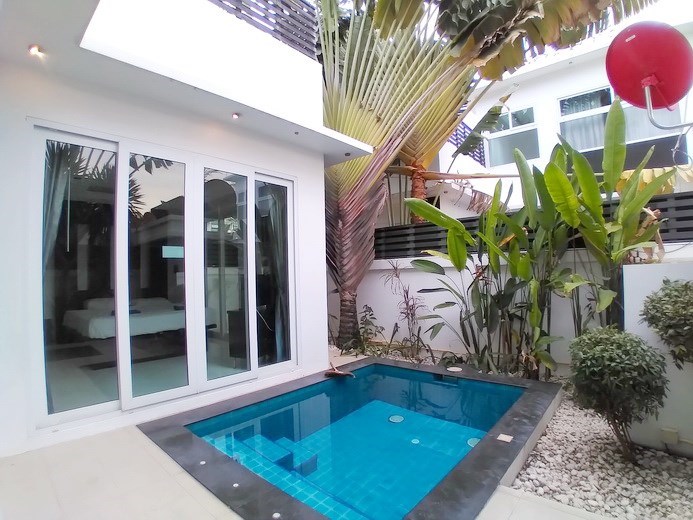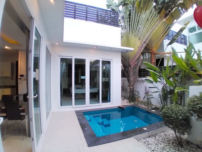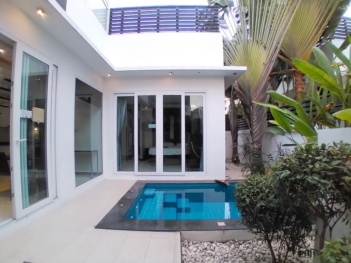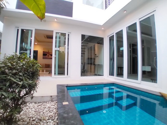 PATTAYA REAL ESTATE: Pool villa for rent Jomtien, 800m to Jomtien beach, land size 108 sqm, living area 124 sqm, 2 bedrooms, 2 bathrooms, European-style kitchen, fully furnished, tropical garden, private plunge / swimming pool, 24-7 security