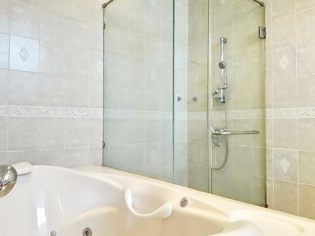 En-suite bathroom with double sinks, Jacuzzi bathtub and shower cubical