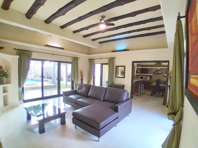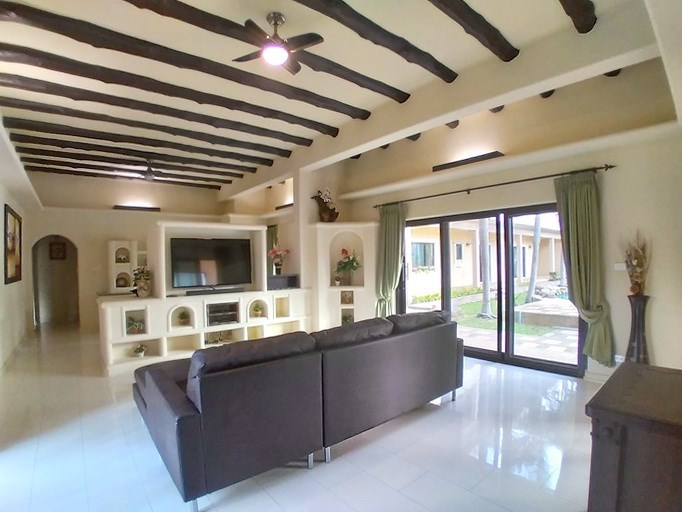 PATTAYA REAL ESTATE: Single floor House for rent Mabprachan Pattaya, Siam country club area, living area 200 sqm, 2 bedrooms, 2+1 bathrooms, fully furnished, communal swimming pool, large garden, covered terrace, close to the international schools, 24-7 security