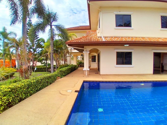 PATTAYA REAL ESTATE: House for rent Mabprachan Pattaya with private swimming pool, land size 800 sqm, living area 250 sqm approx., 4 bedrooms, 3 bathrooms, Office option (4th bedroom), European-style kitchen, fully furnished, garden, private swimming pool, automatic gate