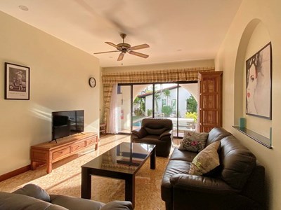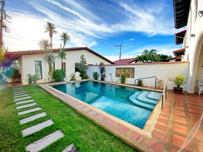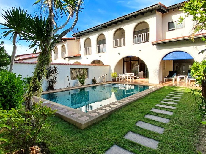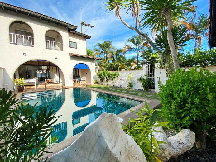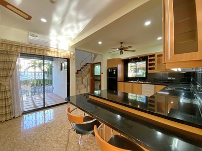 PATTAYA REAL ESTATE: Mediterranean Style 2 Storey Twin-Town house for rent, 3 bedrooms, 3 bathrooms, living room, European-style kitchen, built-in furniture, Private swimming pool, landscaped garden, carport, 24-7 security