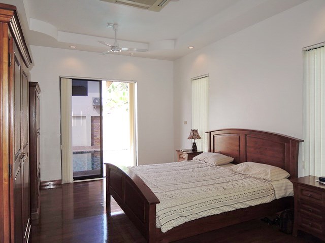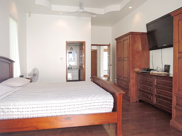 The master bedroom suite has a king-sized bed with twin bedside tables and reading lamps, large teak wardrobes and a media cabinet with a flat screen TV.