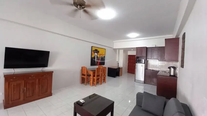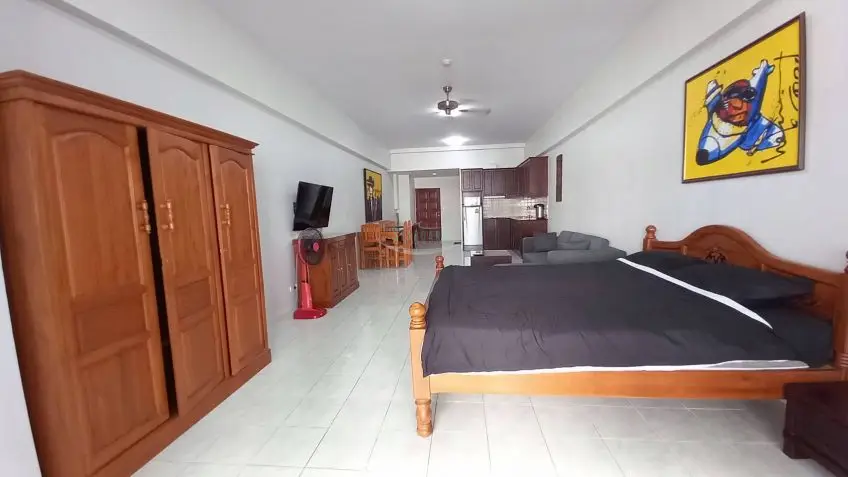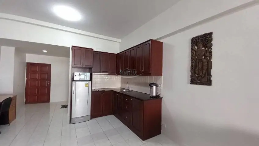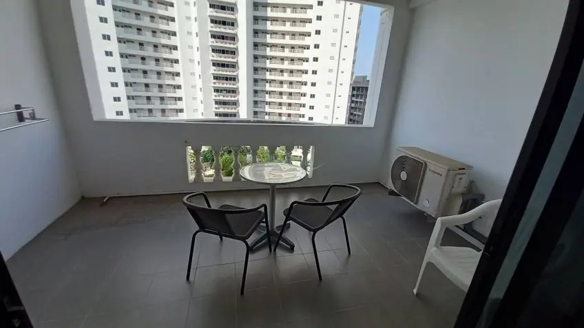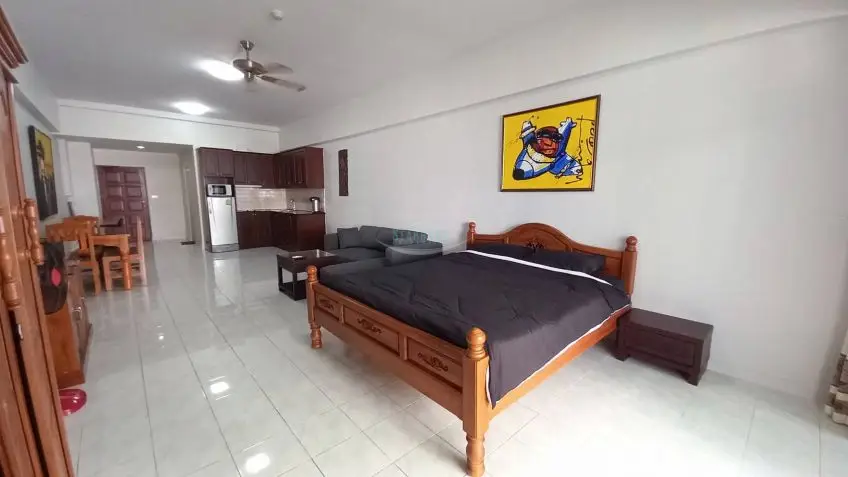Jomtien Complex This large studio apartment with balcony on floor 6 has been refurbished to western standards. It has a European kitchen, bathroom, large living/bedroom area and a well sized balcony with sea view. The building has a large communal swimming pool, gym, sauna, tennis courts, restaurants, laundry room, mini-market and 24-hour security with CCTV. Internet and Cable TV is included in the rental fee. The beach is close by in walking distance and the taxi stop for to Pattaya is in front of the building. For more information, please contact us now.Facilities