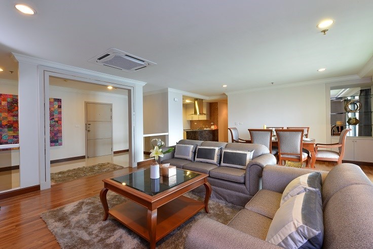 Available to rent at Krystal Court near Nana BTS Skytrain Station is this spacious 3 bedroom, 3 bathroom apartment. The property measures 216 sqm, comes fully furnished and has a large balcony. The building has a swimming pool, tennis court, squash court, sauna, playground, music room and gym and the nearby area is home to a BTS Station and Terminal 21 Shopping Mall. For more details and to arrange a viewing, contact us at BKKCondos.