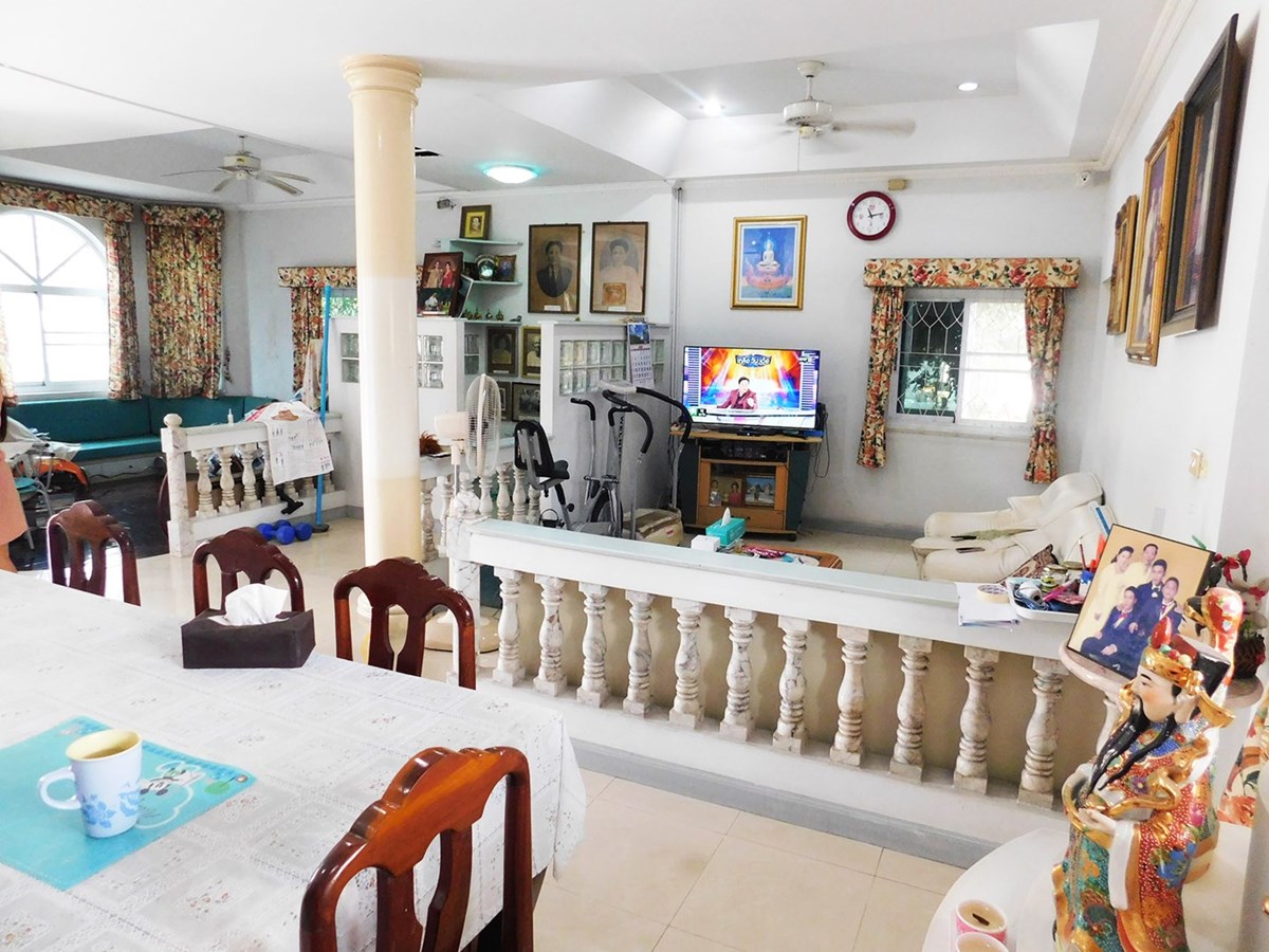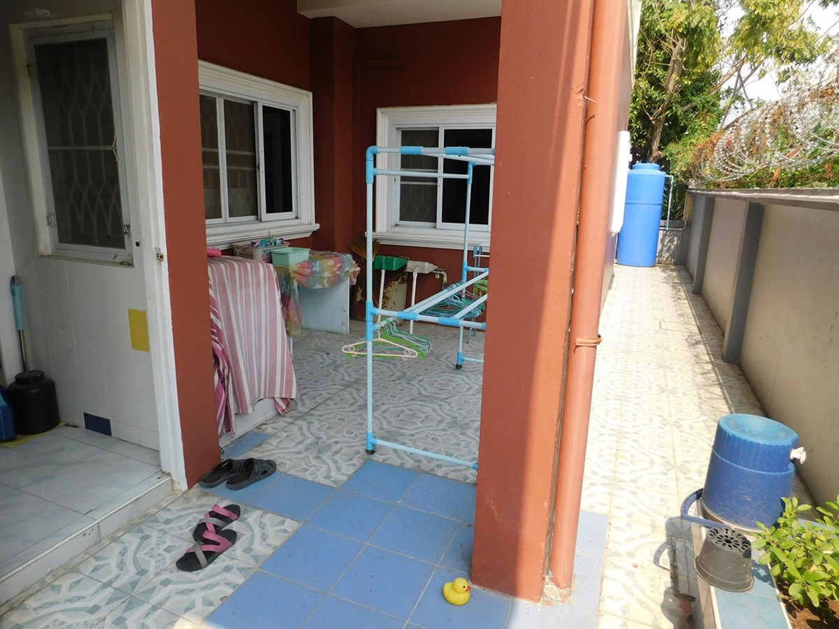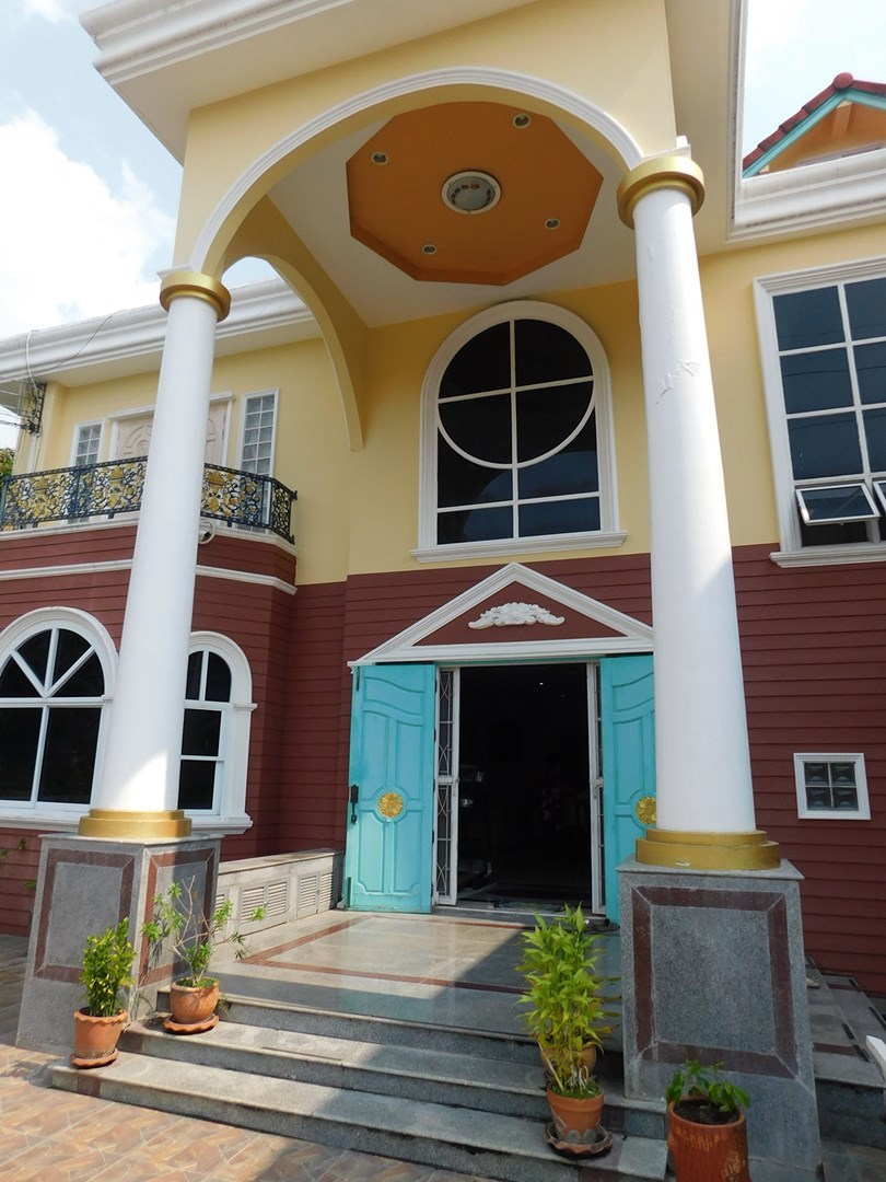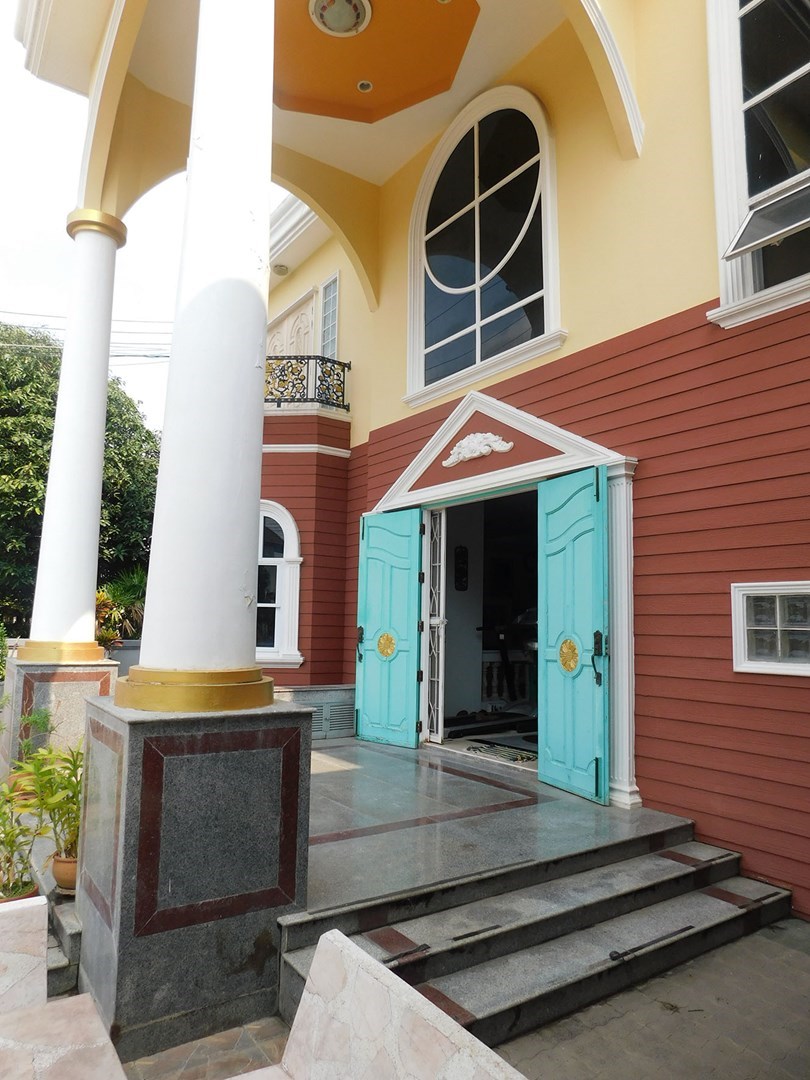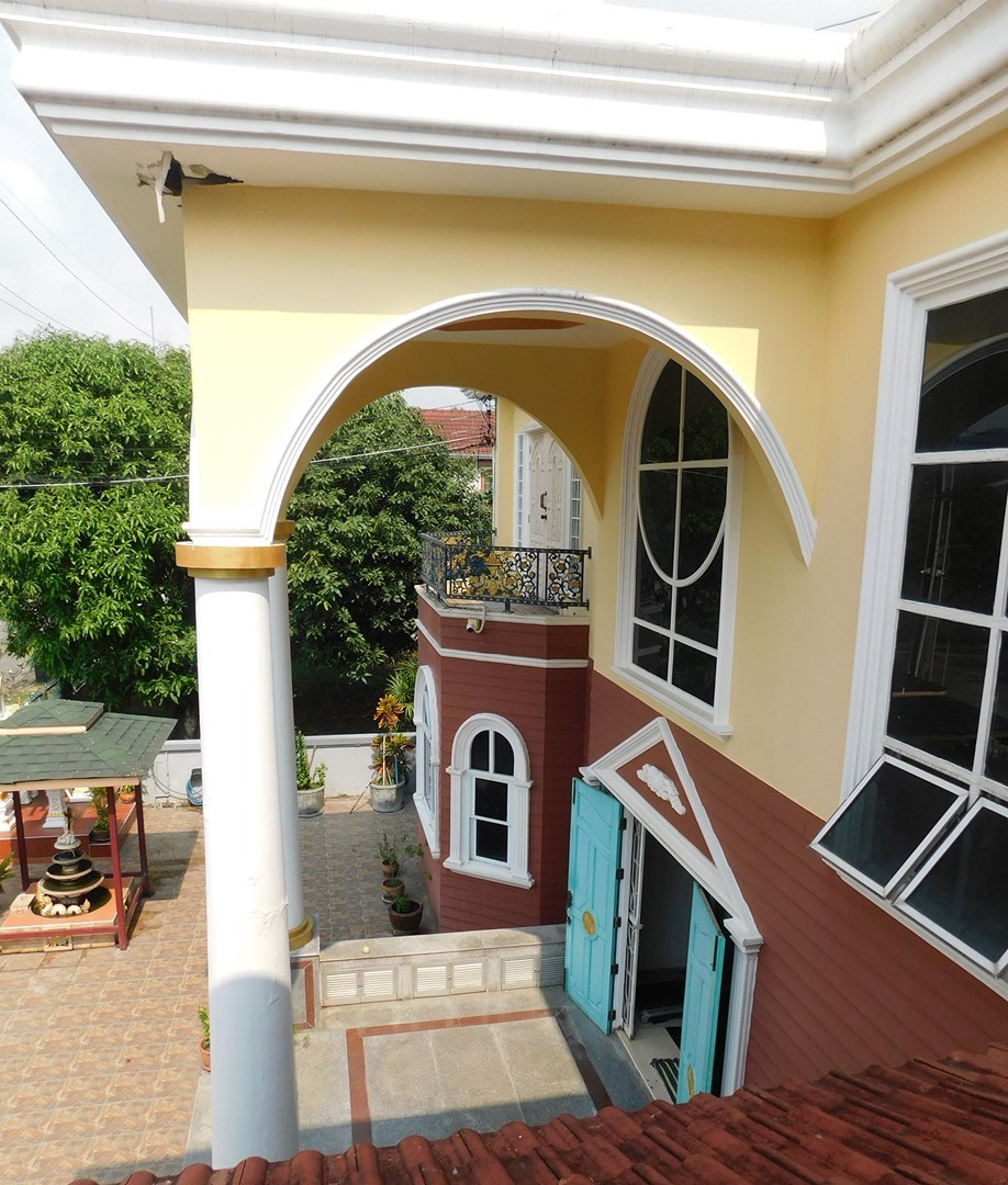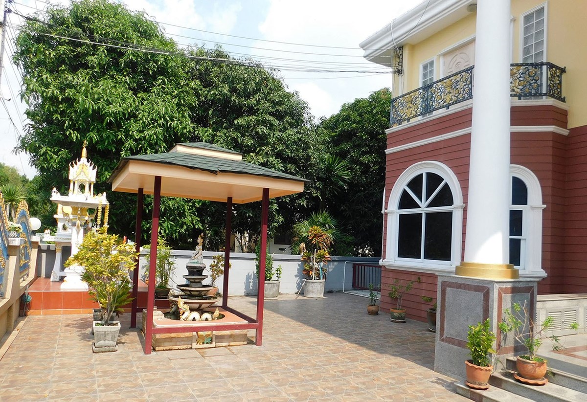 This large 2-storey villa is located in the residential area of Sinthawee Park in Ban Chang. The villa has 6 bedrooms, 5 bathrooms, 2 living rooms, a large kitchen, an office, a Buddha room, as well as a large terrace and several balconies. All bedrooms are equipped with AC and ceiling fans and all bathrooms with wall fans. The total housing area is 430 square meters.