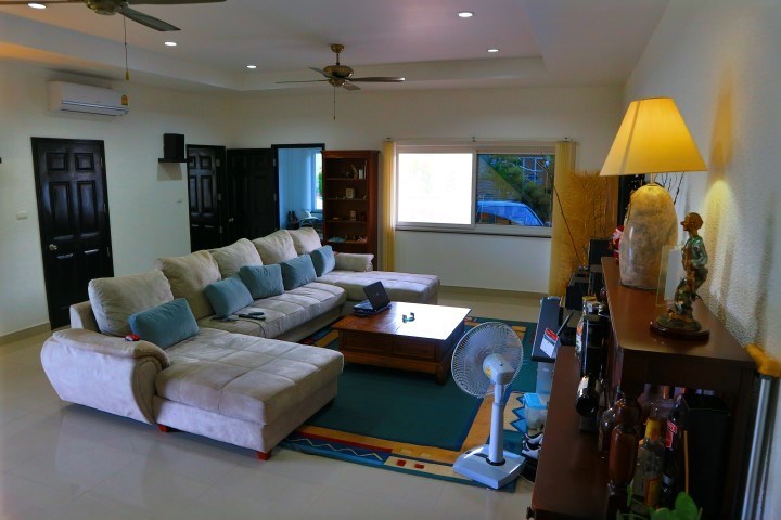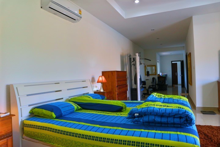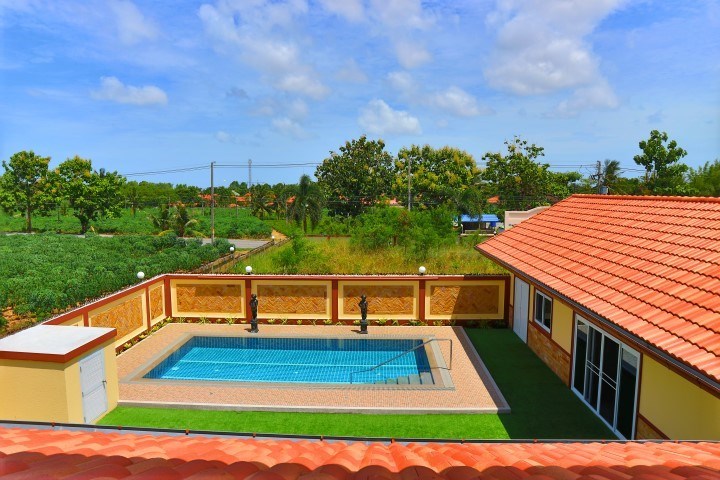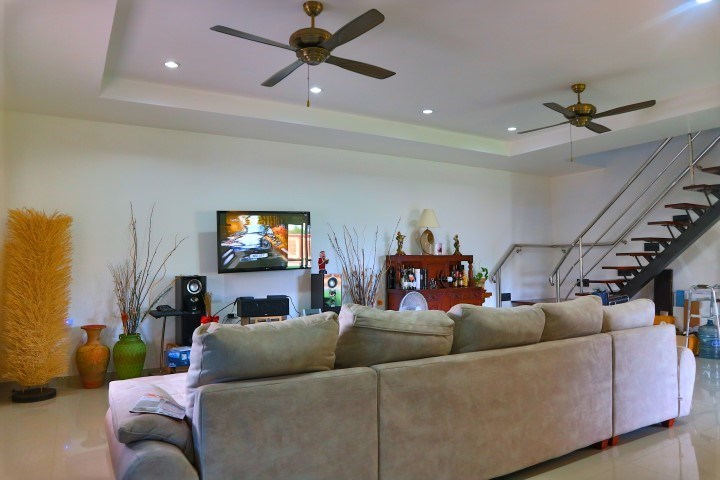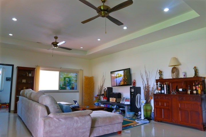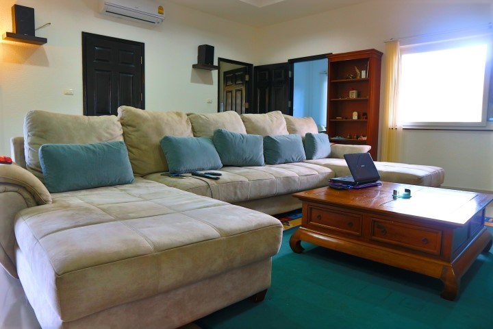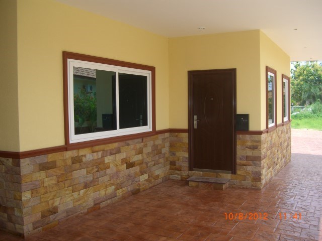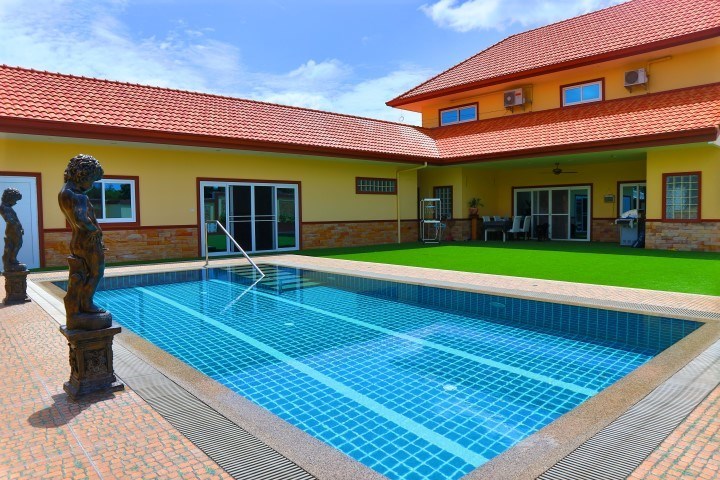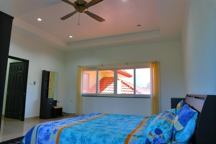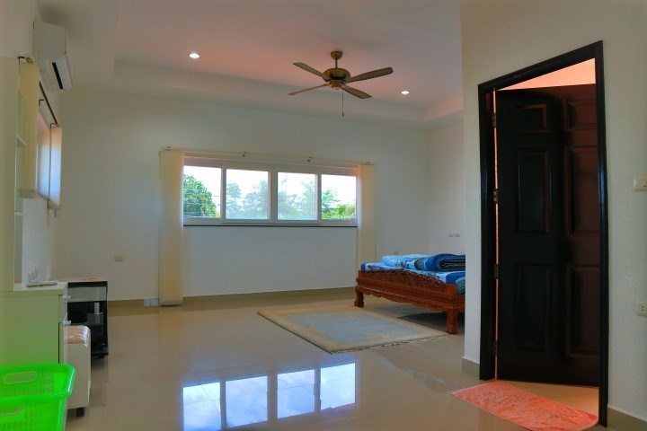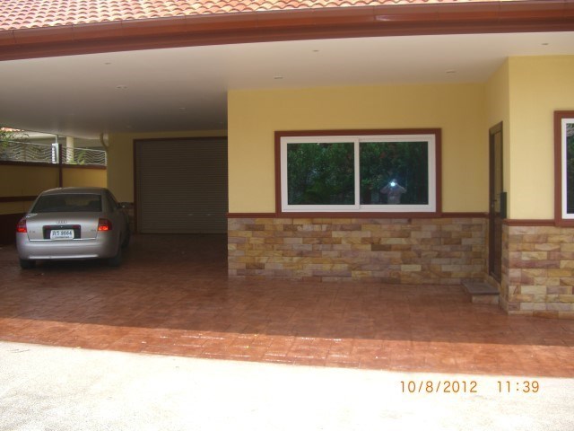 4 bedrooms (1 downstairs and 3 upstairs) house for sale, 5 bathrooms, living area approx. 550 Sqm, land size 640 Sqm (160 TW), large living room and cloakroom, large European Kitchen, office, 4 storage rooms, fully furnished, private swimming pool, garage with roller door, 6 air conditioner, foam insulation in roof, UPVC windows and terrace doors with tinted glass ,steel front door, 24 hour security, located at Mabprachan area, close to golf course, motorway, international school, minimart, restaurant