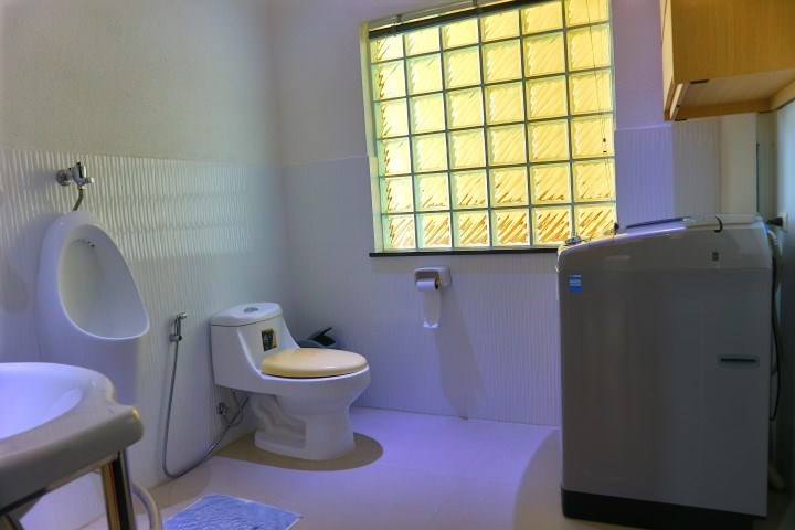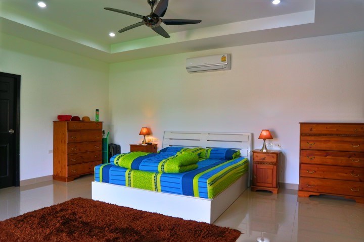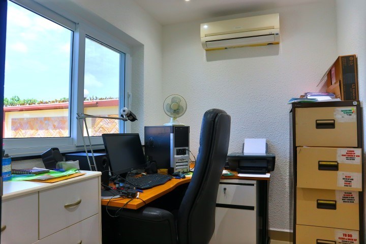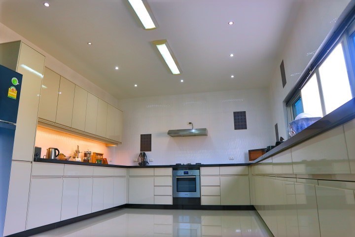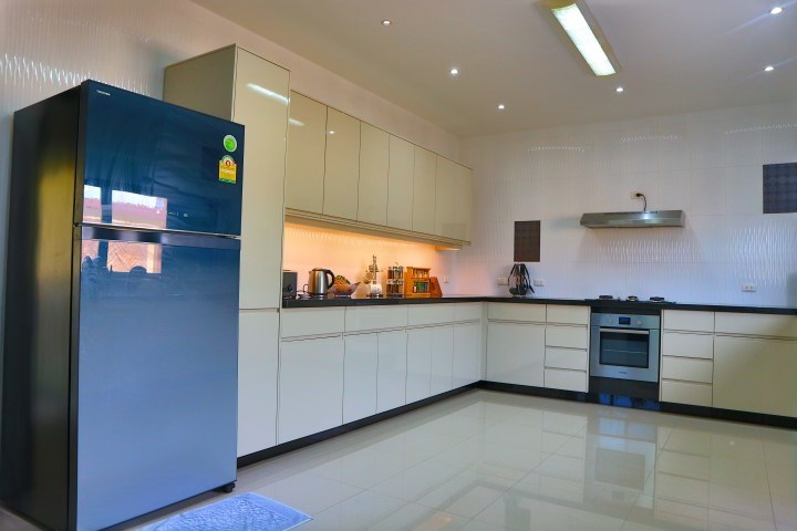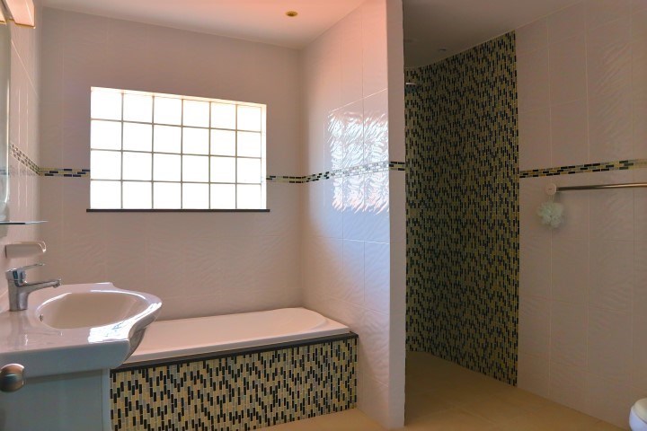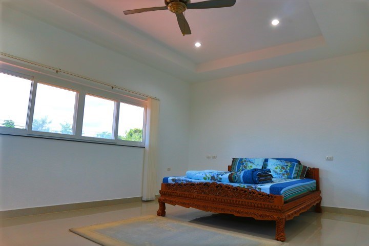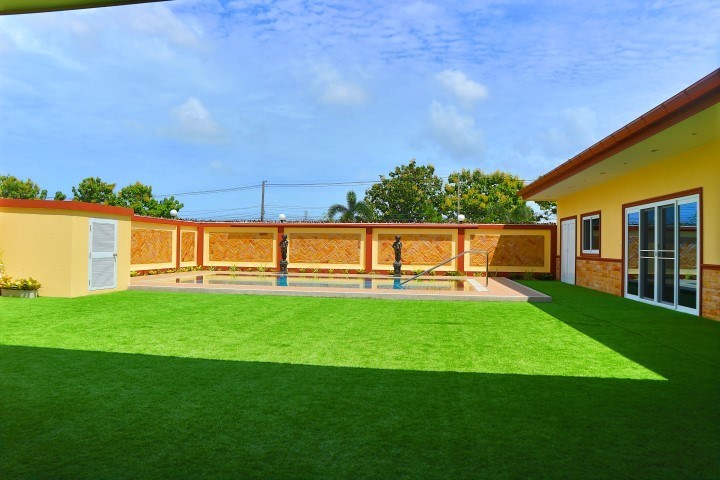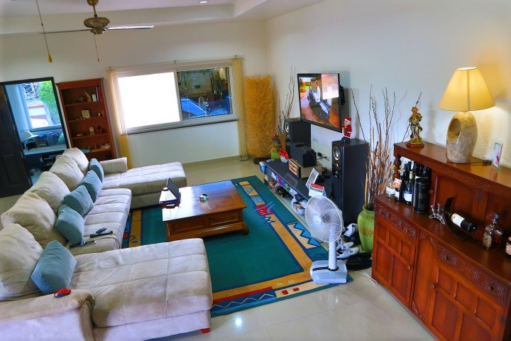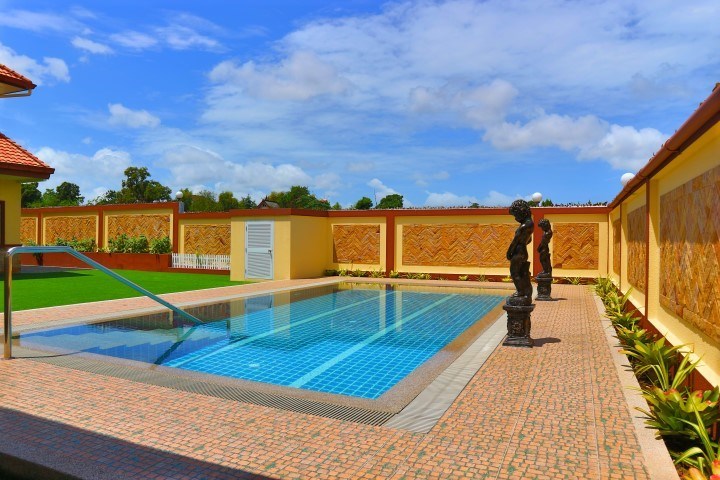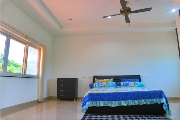 4 bedrooms (1 downstairs and 3 upstairs) house for sale, 5 bathrooms, living area approx. 550 Sqm, land size 640 Sqm (160 TW), large living room and cloakroom, large European Kitchen, office, 4 storage rooms, fully furnished, private swimming pool, garage with roller door, 6 air conditioner, foam insulation in roof, UPVC windows and terrace doors with tinted glass ,steel front door, 24 hour security, located at Mabprachan area, close to golf course, motorway, international school, minimart, restaurant