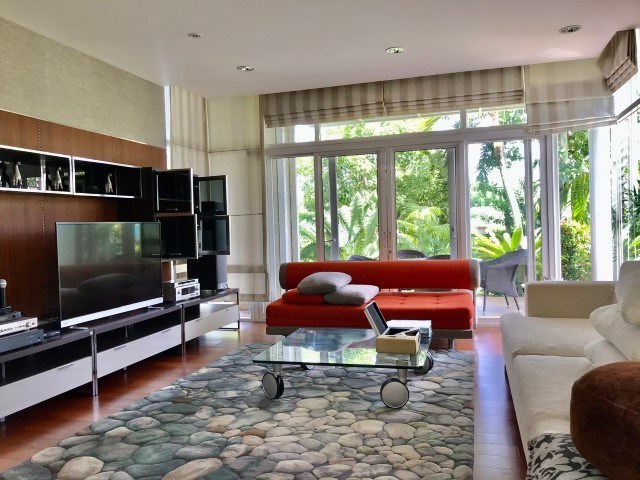 The large living room offers views of the pool and garden, creating a seamless indoor-outdoor living experience.