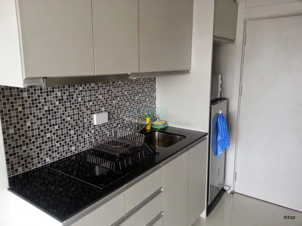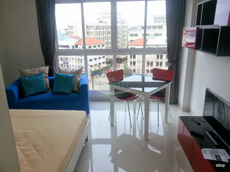 This top-floor studio unit is in a modern condominium development in South Pattaya. It is conveniently located close to all amenities, such as shops, restaurants, shopping complexes, nightlife, and the beach. This 24m² studio apartment has been furnished to a good, modern standard and includes a kitchenette, A/C, flat-screen TV, and quality bathroom. WIFI connection is also available through the building at an additional charge. The building has a communal swimming pool, gymnasium, sauna, underground parking, CCTV, and 24-hour security.