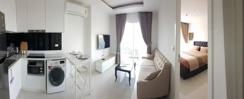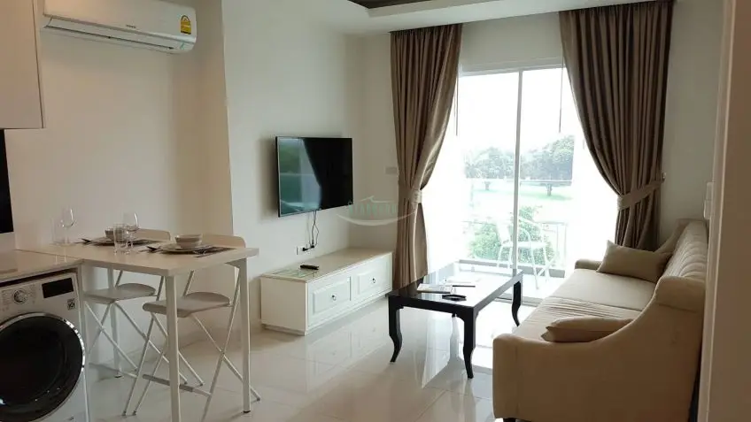One Tower Pratumnak Completed in 2017 this modern high rise tower sits along the Pratumnak Hill coastline, across to the famous Asia Hotel and very close to the beachfront restaurant & resort “Cabbages and Condoms”. The beach here is clean and quiet plus there is a small golf course right in front of the building. This apartment is on floor 4, a one bedroom apartment with a total living space of 47 sq.m. It comes fully furnished and is ready to move in. From the developer package it boasts a high quality built-in European kitchen with all electrical appliances, and a washing machine. There is a very open feel to the unit and the living room balcony looks back up the hillside to the Golden Buddha at the top, and across the golf course. The bedroom is well sized and has a King size bed. There are floor to ceiling wardrobes and an adjoin bathroom with window right next to the rain shower. This project is located in walking distance to the beach and a wide range of restaurants. Facilities at One Tower include: A 12th floor swimming pool, fitness center, steam & sauna. There is 24/7 security, multi-level car parking and on-site management with English speaking staff. Offered for long term RENT. 6 months at 24,000 Baht per month and 12 months at 22,000 Baht per month. Cable TV and Internet included. For more information, please contact us now.Facilities