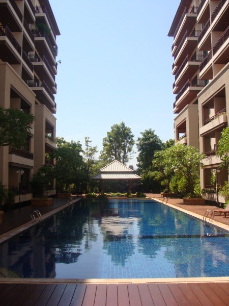 Top location on south Pattaya Road close to the junction of 3rd Road. Resort style project with large green areas and fish ponds. Partly furnished (kitchen, aircon, beds, wardrobes).