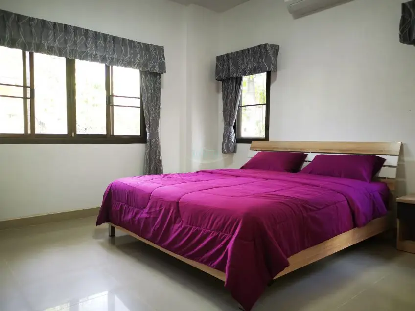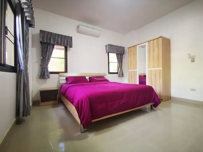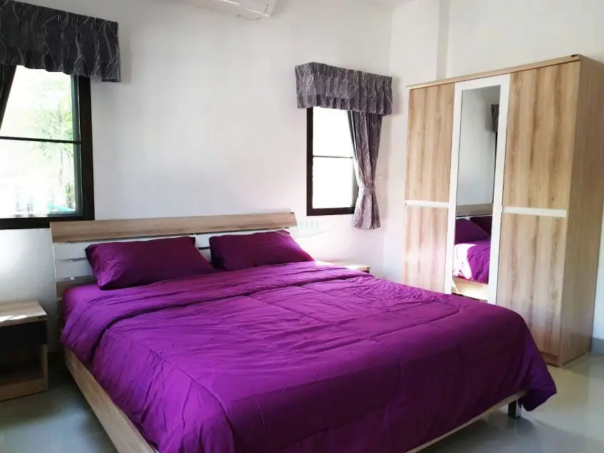 Pornthep Village 3 A nice 3 bedroom, 2 bathroom house located in a secure village just on the outskirts of town. The village is very well organized and provides a communal swimming pool and gardens plus 24-hour security guards. The house is set upon an 85wah² land plot (340sq.m) which is sufficient for off-road parking, a small garden and patio to the front, and spacious living space. The home is fully furnished, has air conditioning throughout, with ceiling fans, built-in European kitchen, TV, plus cable & internet connections payable at an additional charge. Offered for long term Rent with a yearly contract at 22,000 Baht, Offered for Sale at 3.9 Mil. Baht, seller open to negotiating a payment plan. For more information, and to arrange a viewing, please contact us now.Facilities