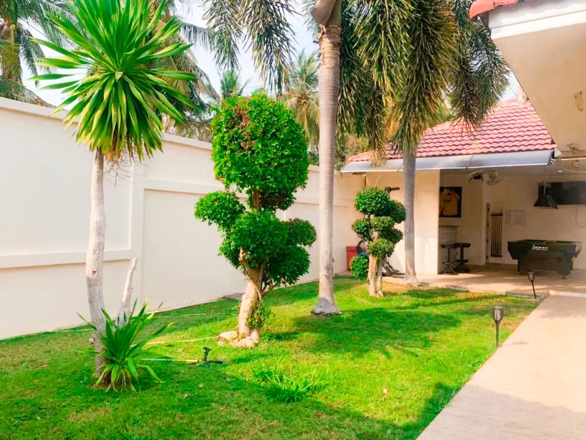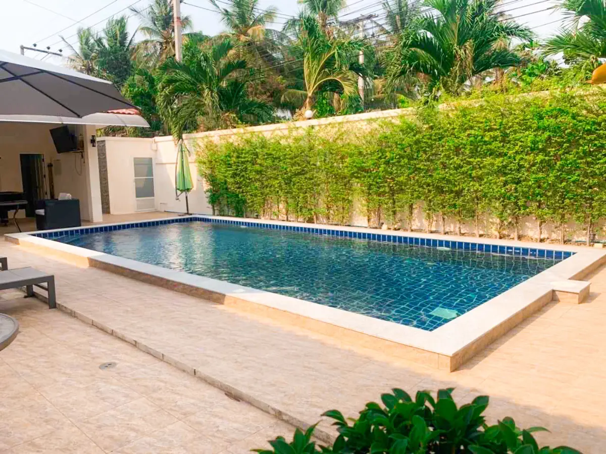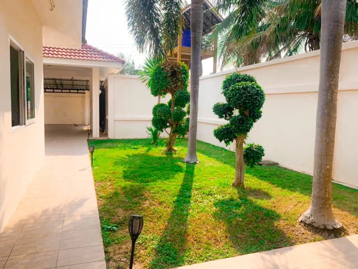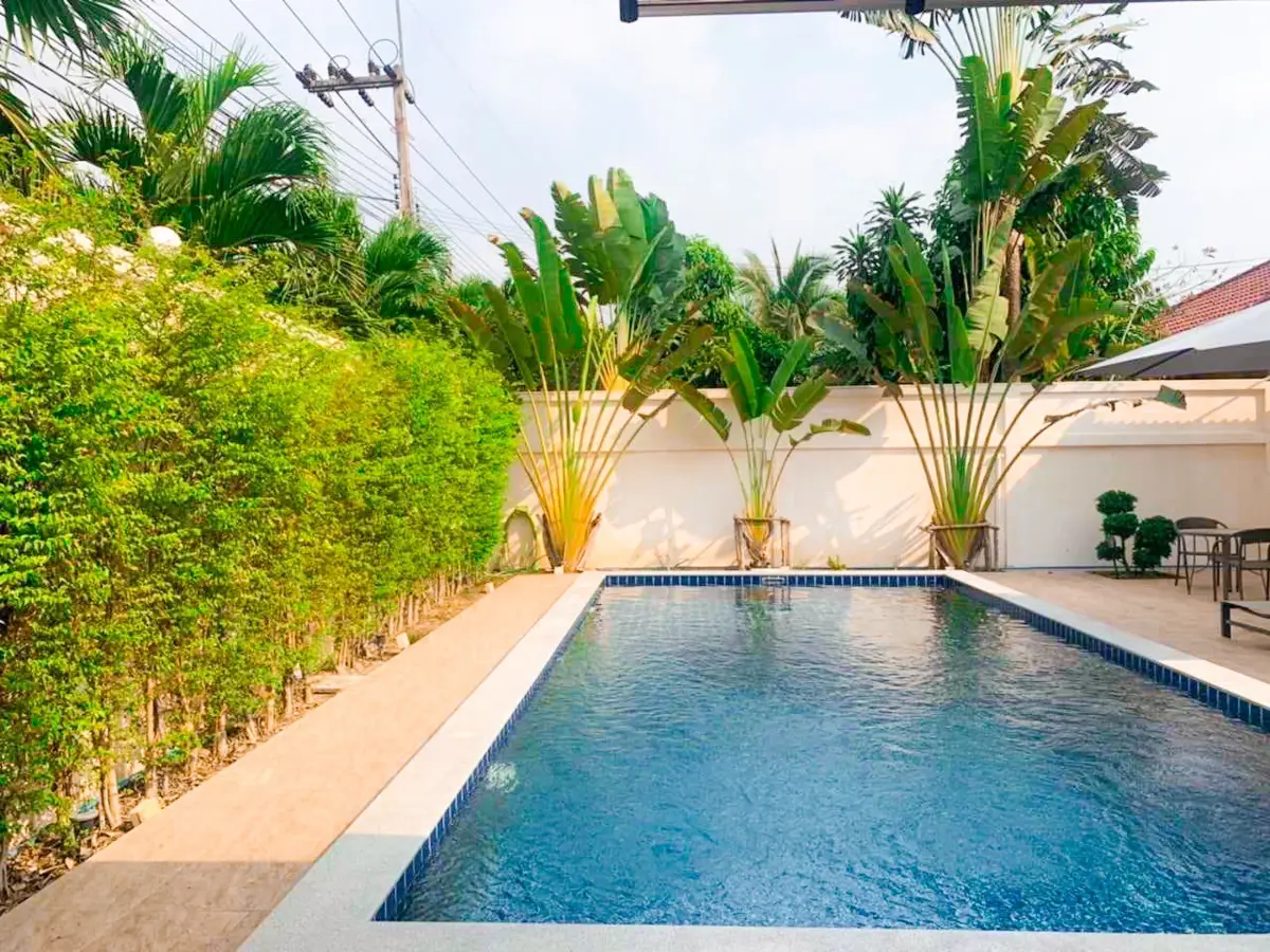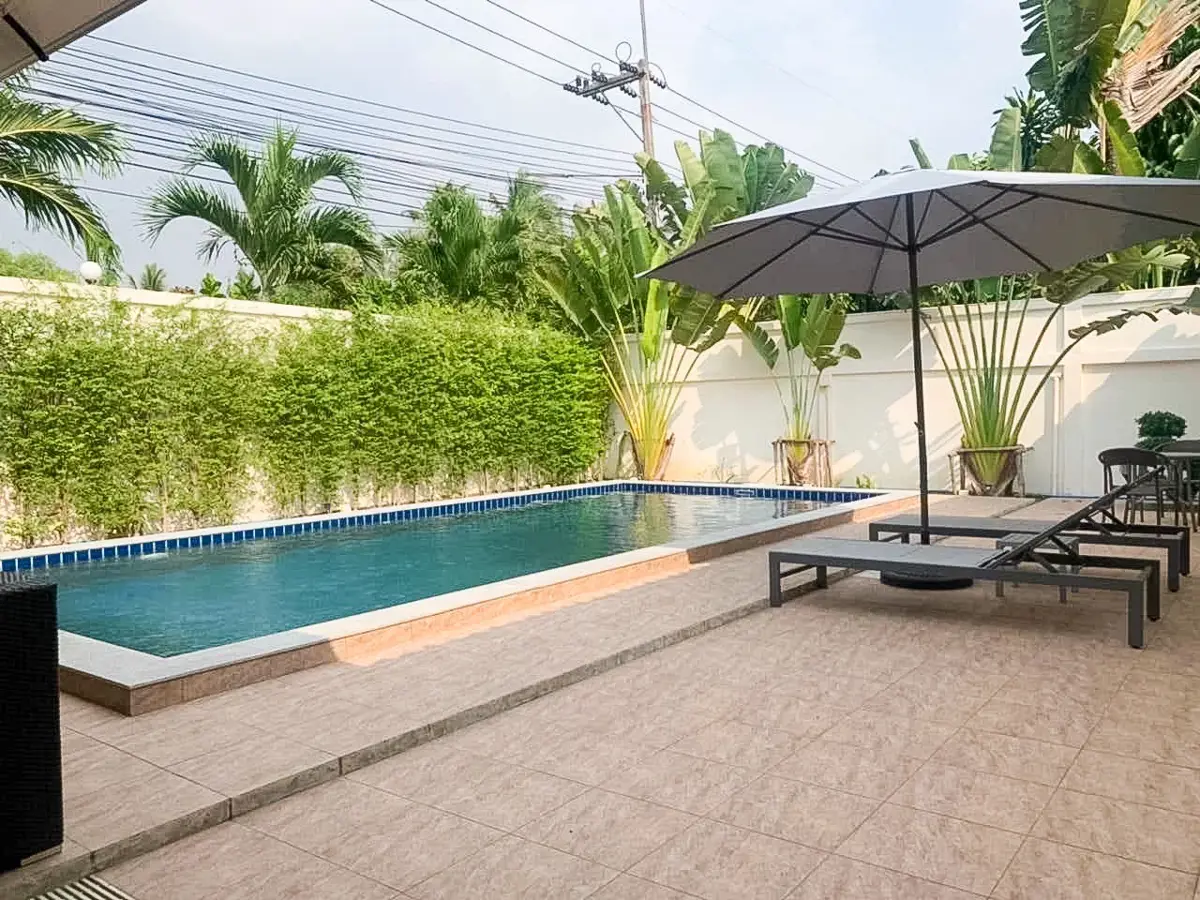 Beautiful single house with nice landscape garden and large private swimming pool (salt system), land size 130.5 TW ( 522 Sqm), living area 200 Sqm, 3 bedrooms, 4 bathrooms, fully furnished, European kitchen, 3 aircon, CCTV, automatic gate, smart TVs, laundry room, 3 carports, high boundary walls, pool table & bar room.