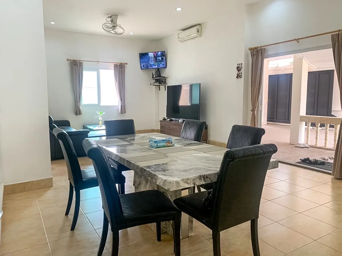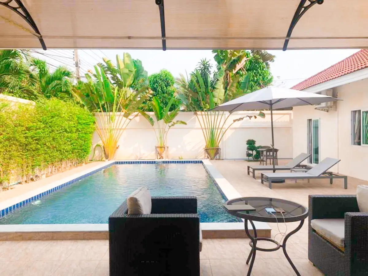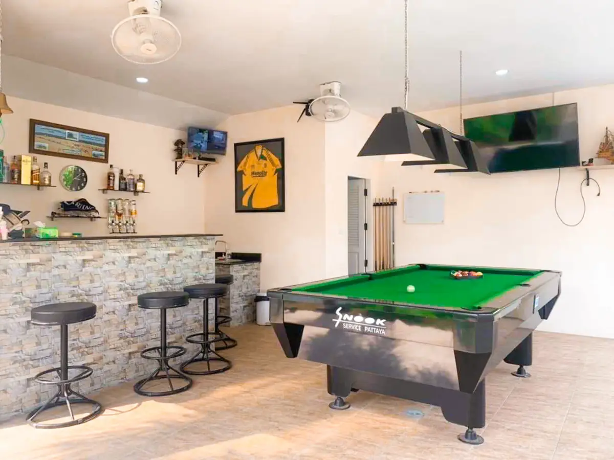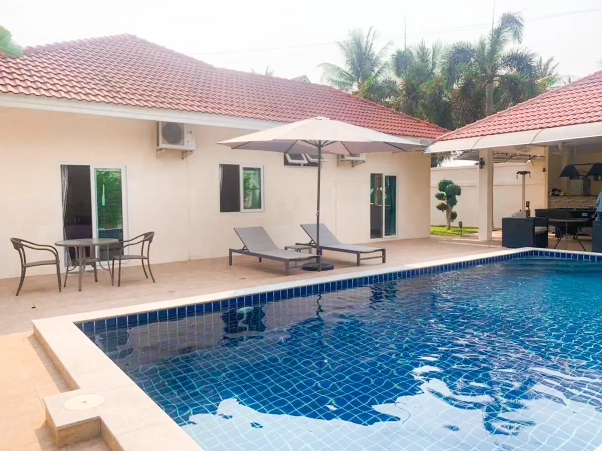 Beautiful single house with nice landscape garden and large private swimming pool (salt system), land size 130.5 TW ( 522 Sqm), living area 200 Sqm, 3 bedrooms, 4 bathrooms, fully furnished, European kitchen, 3 aircon, CCTV, automatic gate, smart TVs, laundry room, 3 carports, high boundary walls, pool table & bar room.