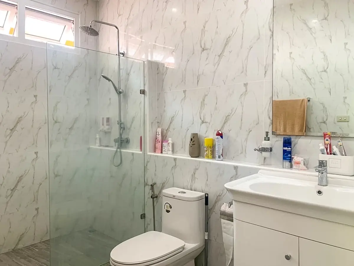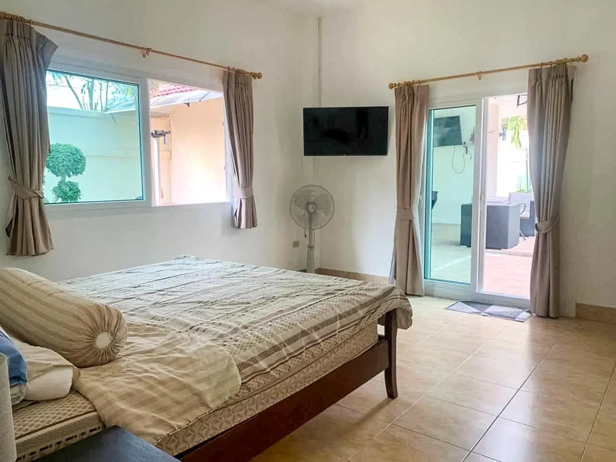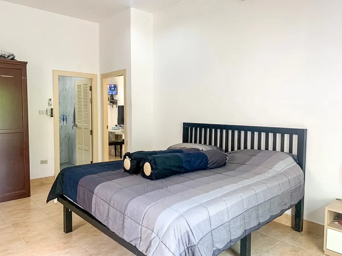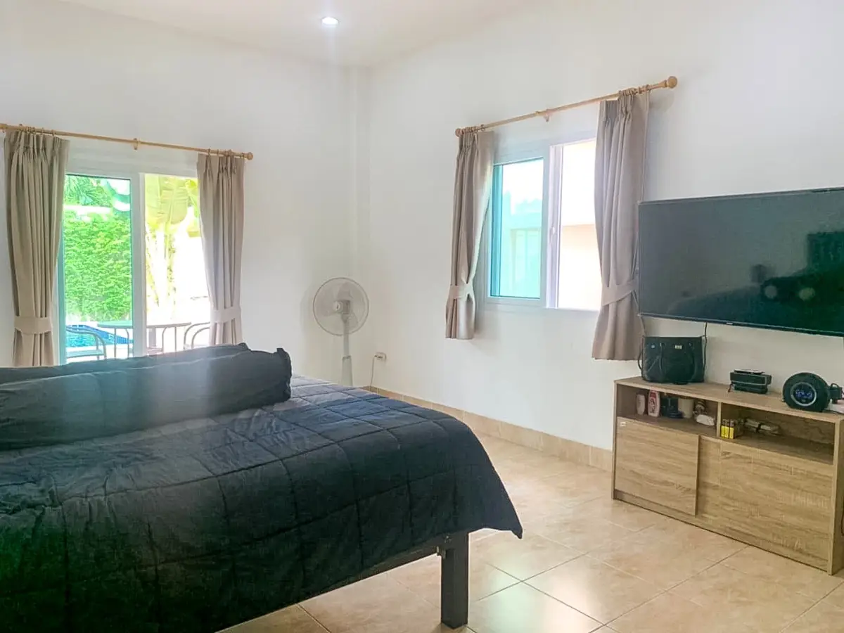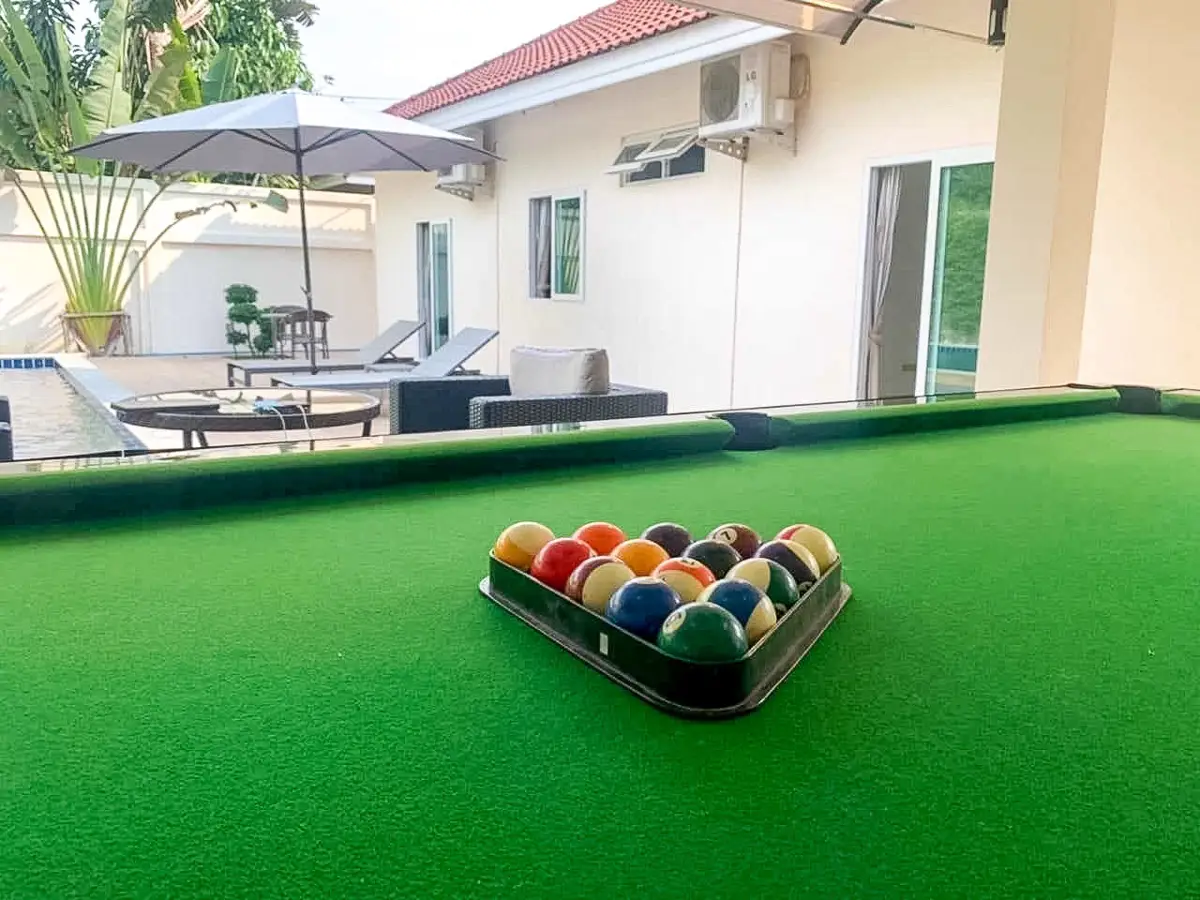 Beautiful single house with nice landscape garden and large private swimming pool (salt system), land size 130.5 TW ( 522 Sqm), living area 200 Sqm, 3 bedrooms, 4 bathrooms, fully furnished, European kitchen, 3 aircon, CCTV, automatic gate, smart TVs, laundry room, 3 carports, high boundary walls, pool table & bar room.