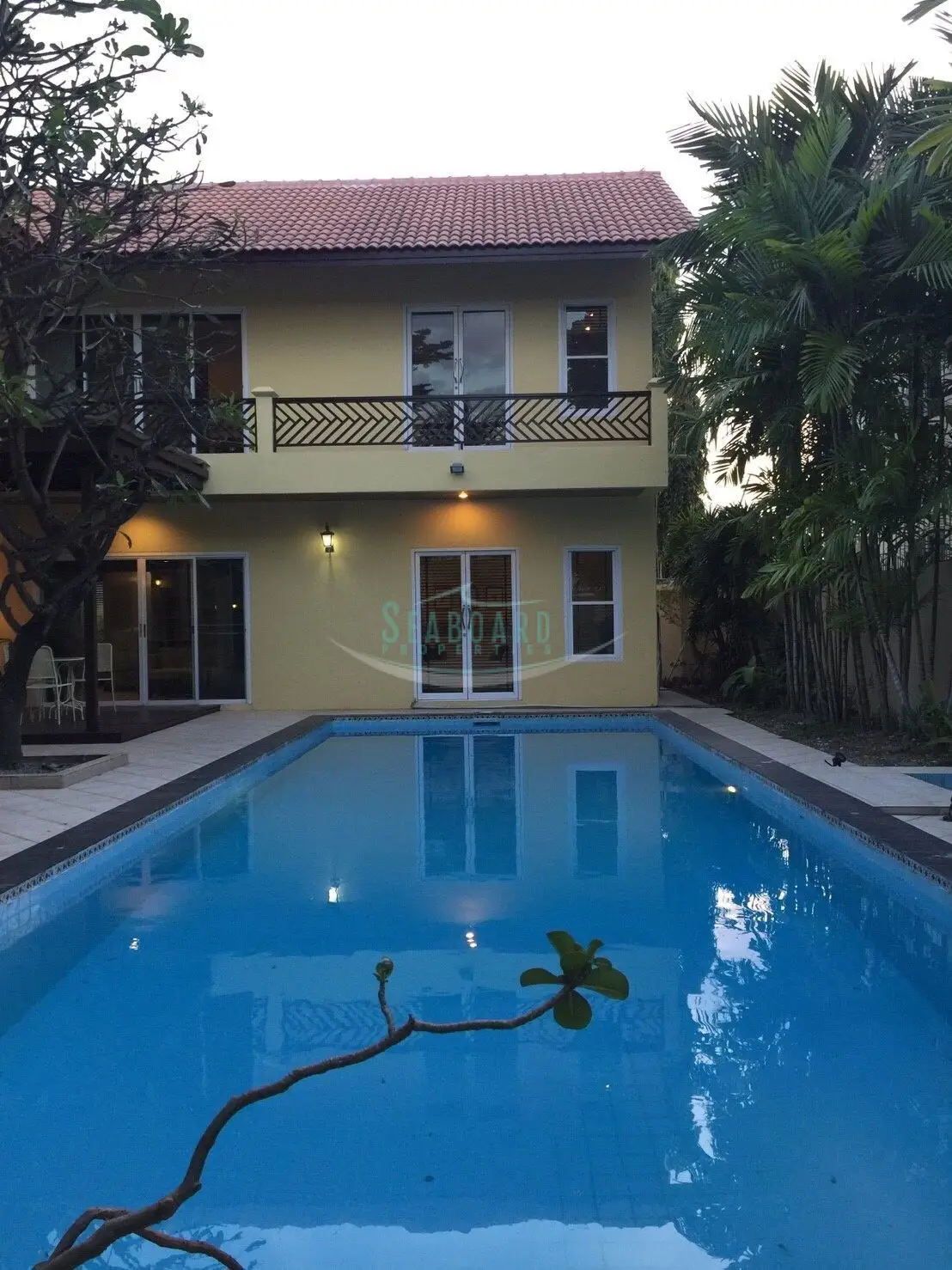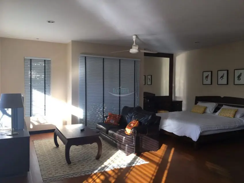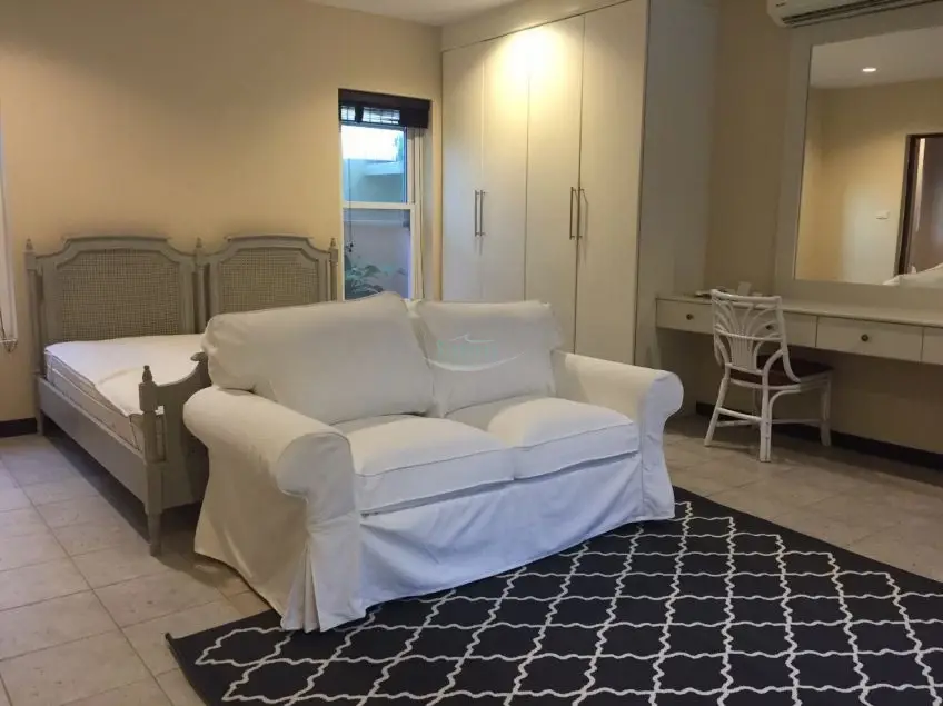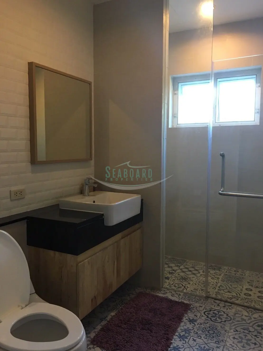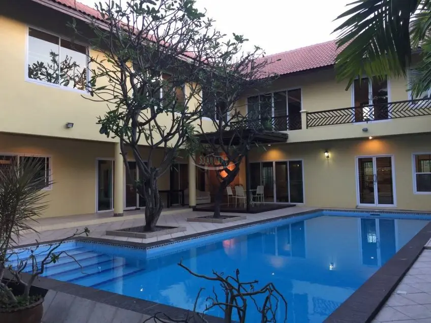 Two storey house with private pool in Jomtien at a quiet location. The development is only a few minutes drive to Jomtien beach, has very good security, CCTV and is very well maintained. The outside area boasts a private swimming pool and garden area with sun lounge space, water features and private secure parking for two cars with electric gates. The house has a very spacious living area with beautiful views to the garden and private pool area. Furnished to a high standard the house has a modern fully functional European kitchen with 4 bedrooms and 5 bathrooms. It is offered for rent on a monthly basis at 100,000 Baht per month. The house is rented fully furnished.