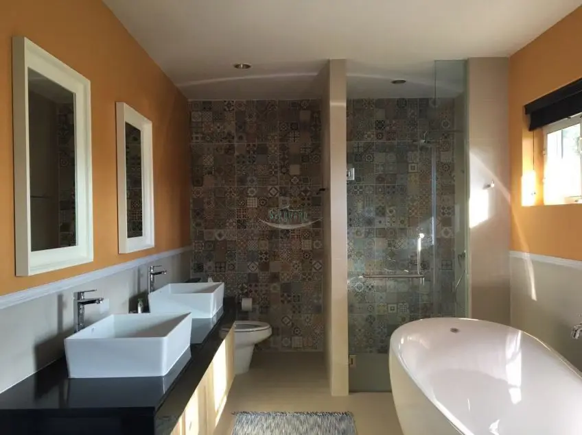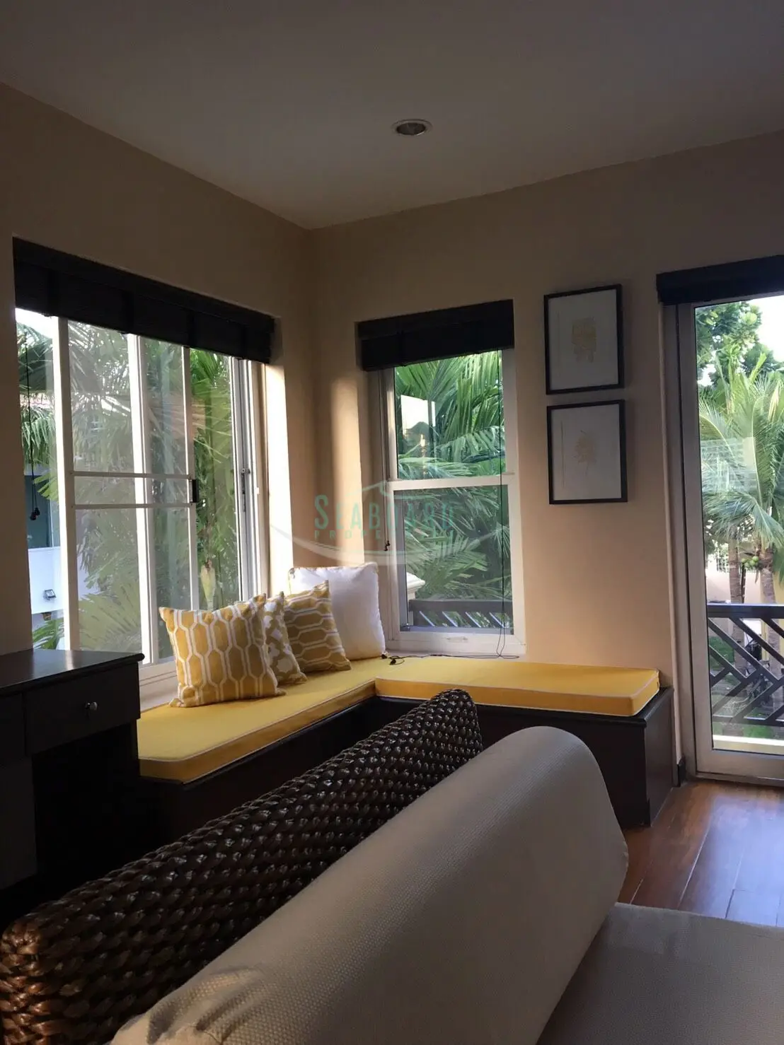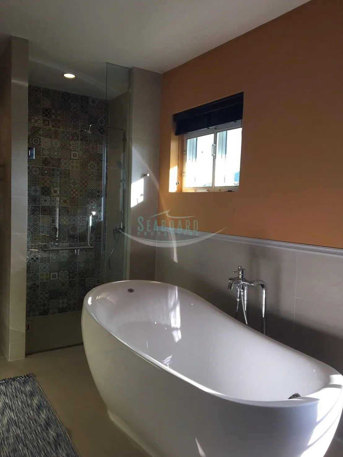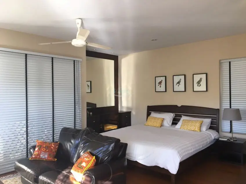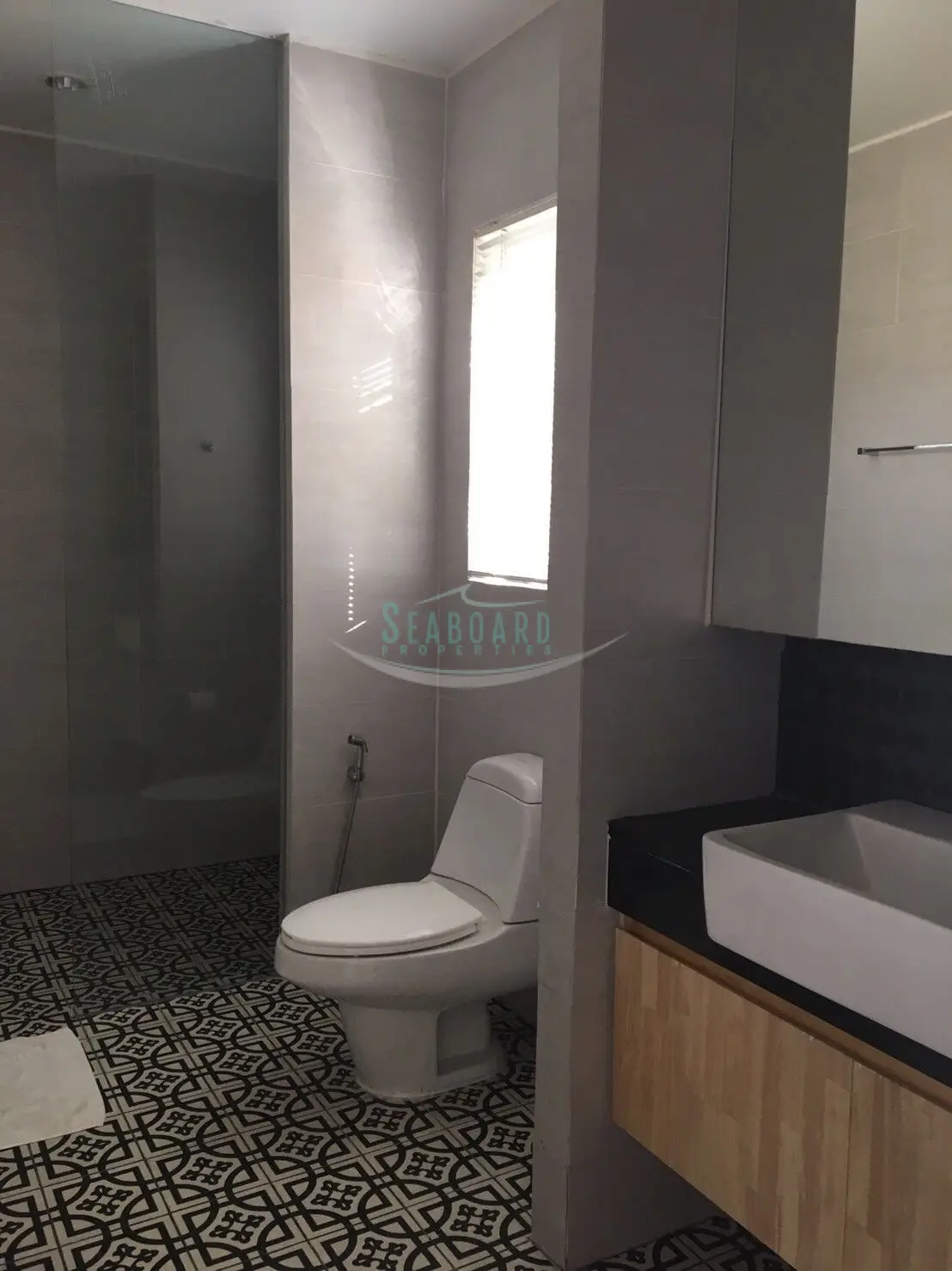 Two storey house with private pool in Jomtien at a quiet location. The development is only a few minutes drive to Jomtien beach, has very good security, CCTV and is very well maintained. The outside area boasts a private swimming pool and garden area with sun lounge space, water features and private secure parking for two cars with electric gates. The house has a very spacious living area with beautiful views to the garden and private pool area. Furnished to a high standard the house has a modern fully functional European kitchen with 4 bedrooms and 5 bathrooms. It is offered for rent on a monthly basis at 100,000 Baht per month. The house is rented fully furnished.