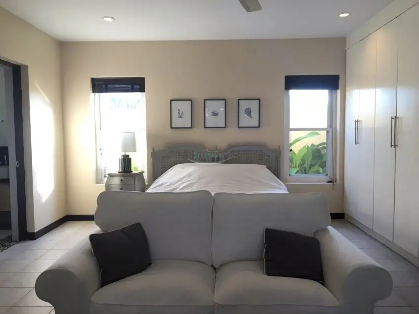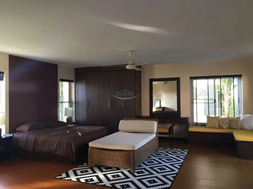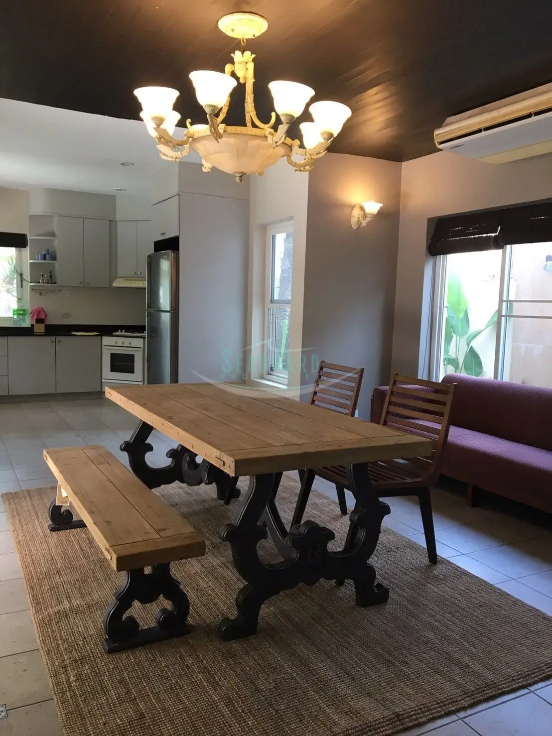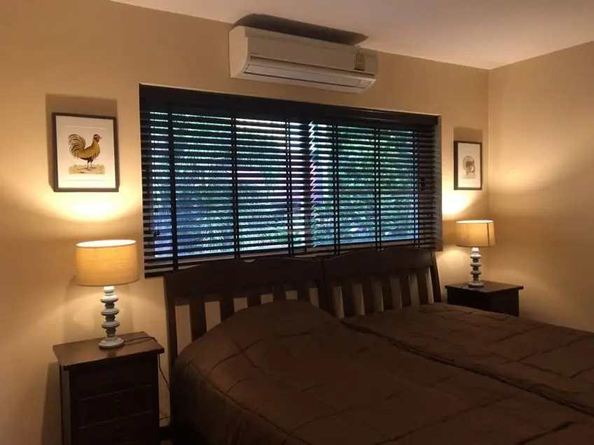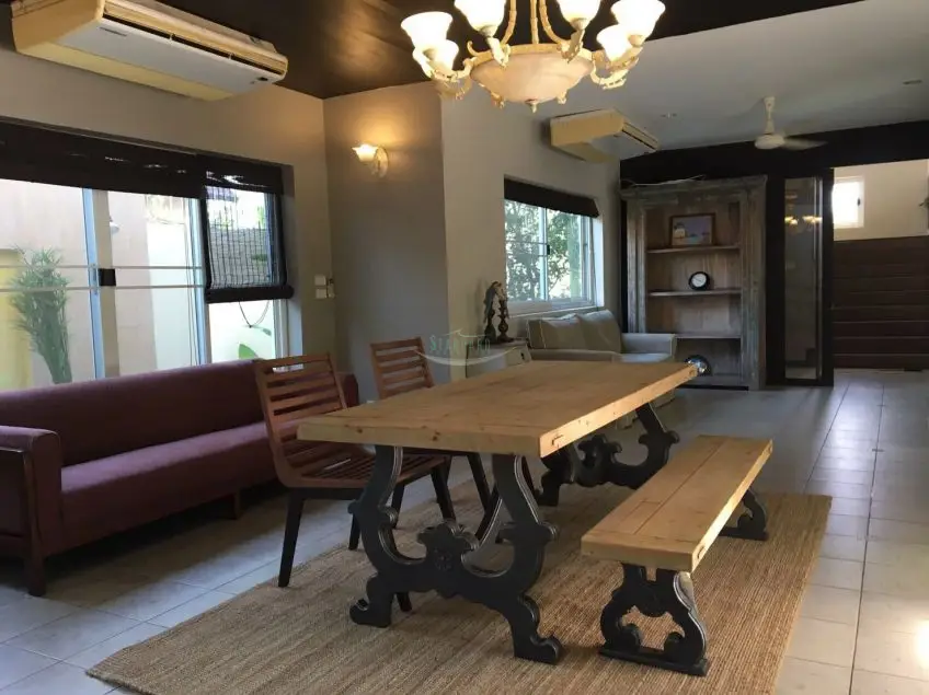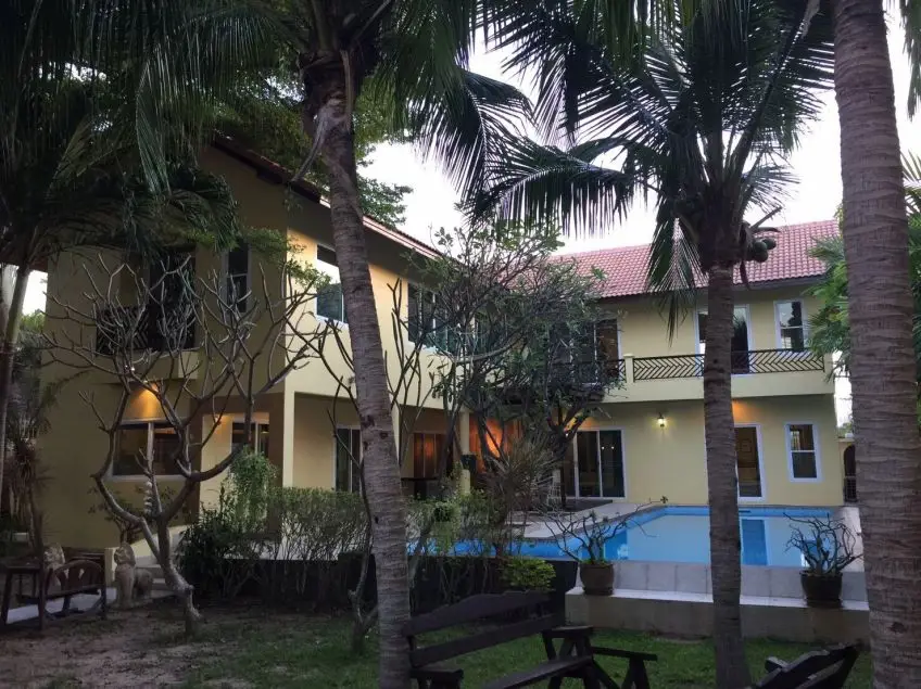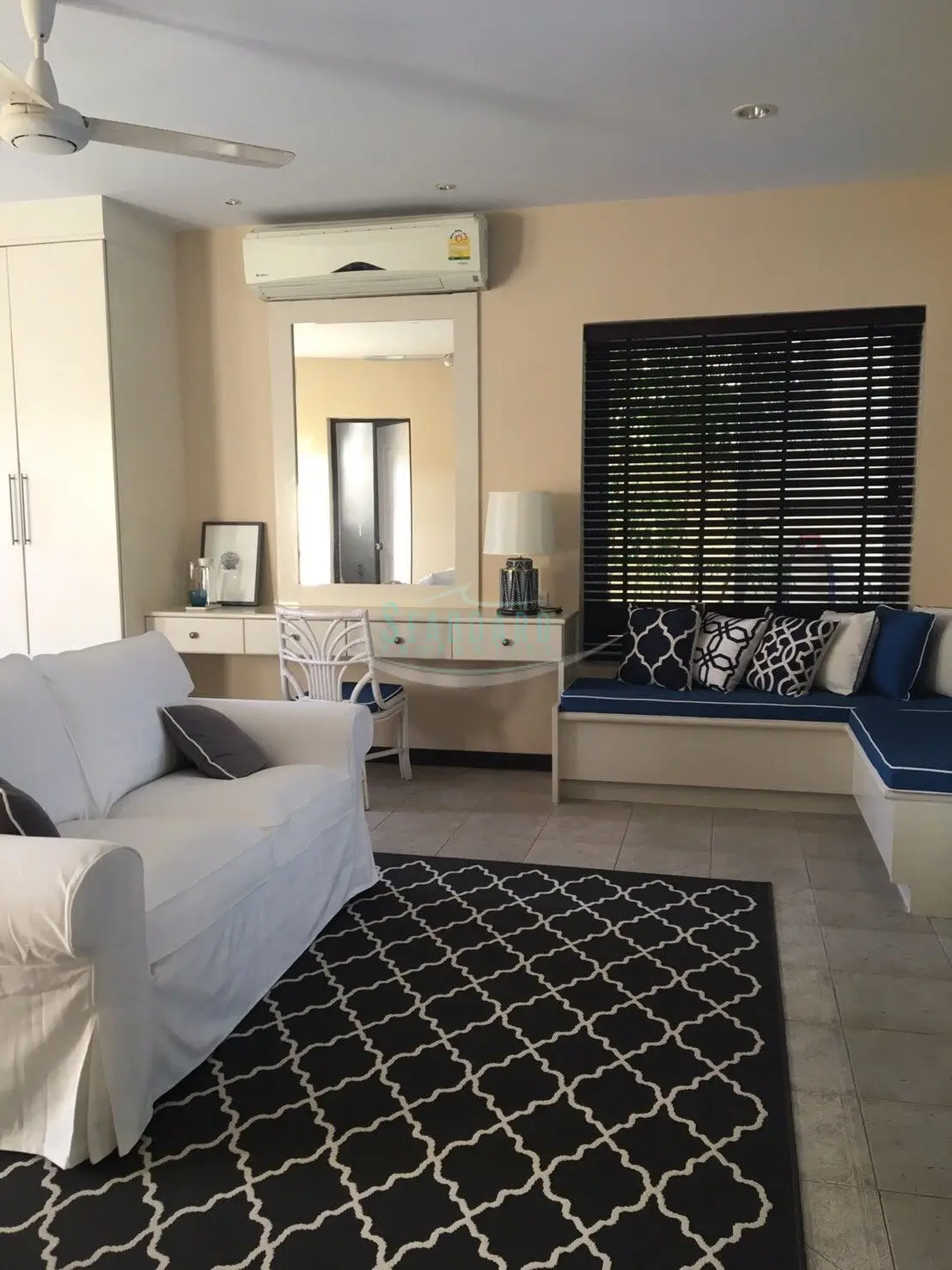 Two storey house with private pool in Jomtien at a quiet location. The development is only a few minutes drive to Jomtien beach, has very good security, CCTV and is very well maintained. The outside area boasts a private swimming pool and garden area with sun lounge space, water features and private secure parking for two cars with electric gates. The house has a very spacious living area with beautiful views to the garden and private pool area. Furnished to a high standard the house has a modern fully functional European kitchen with 4 bedrooms and 5 bathrooms. It is offered for rent on a monthly basis at 100,000 Baht per month. The house is rented fully furnished.