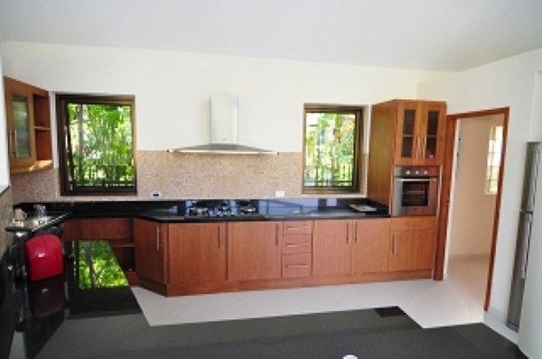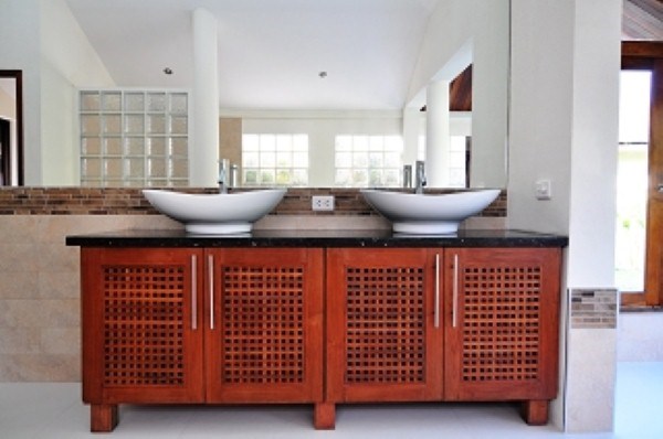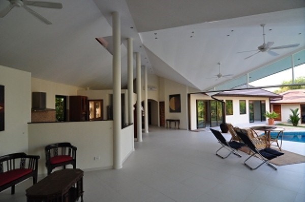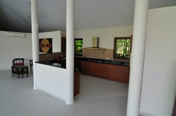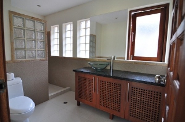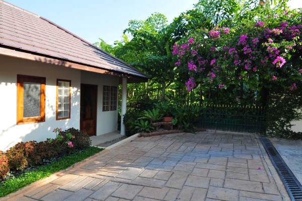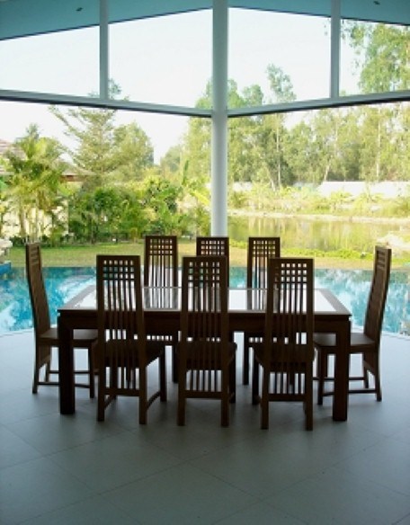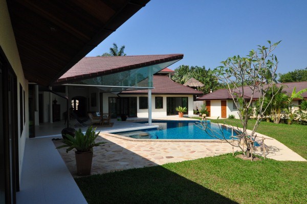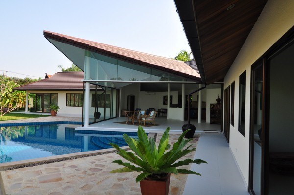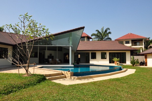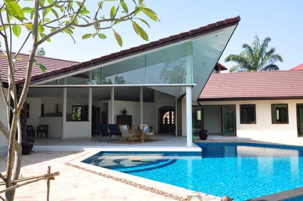 An architectural dream: spacious designer house built to highest standards, main house with 2 guest bedrooms, master suit with walk-in and office, sep. guest bungalow. The 100+ sq.m. living-dining area can be opened up completely towards the tropical garden and the Lotus pond.