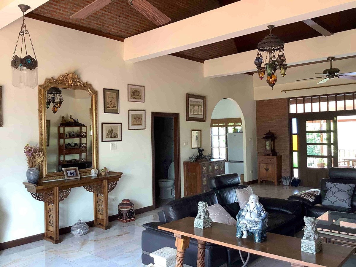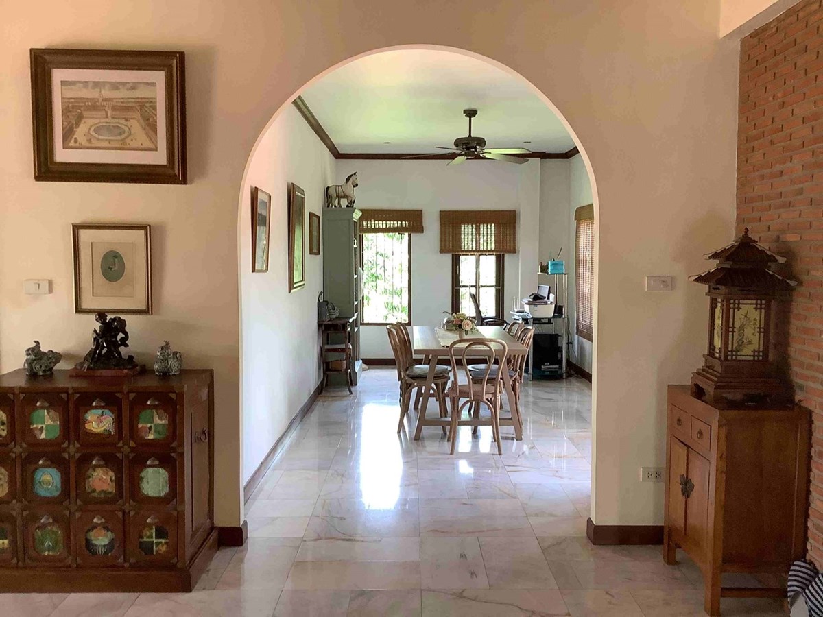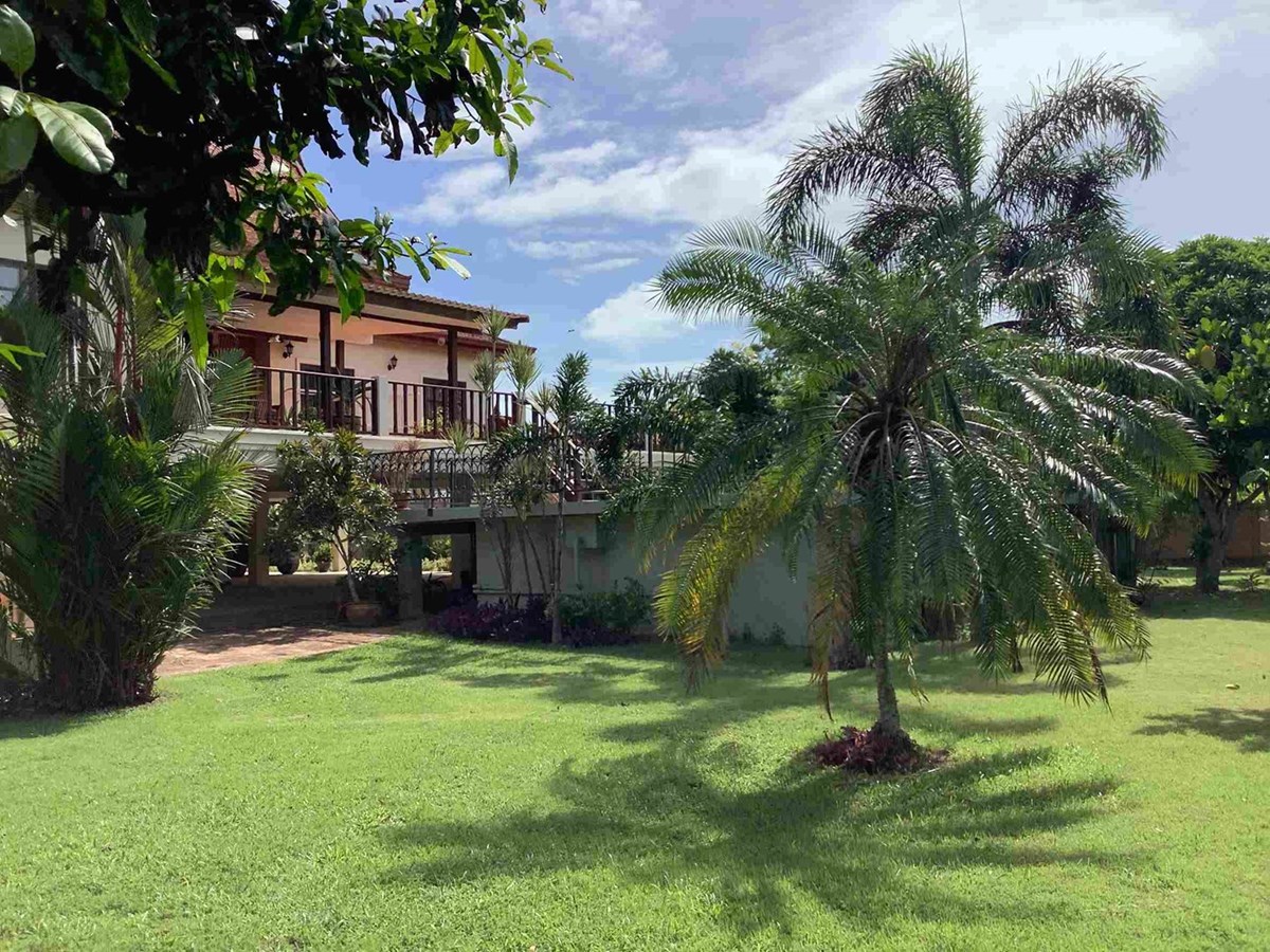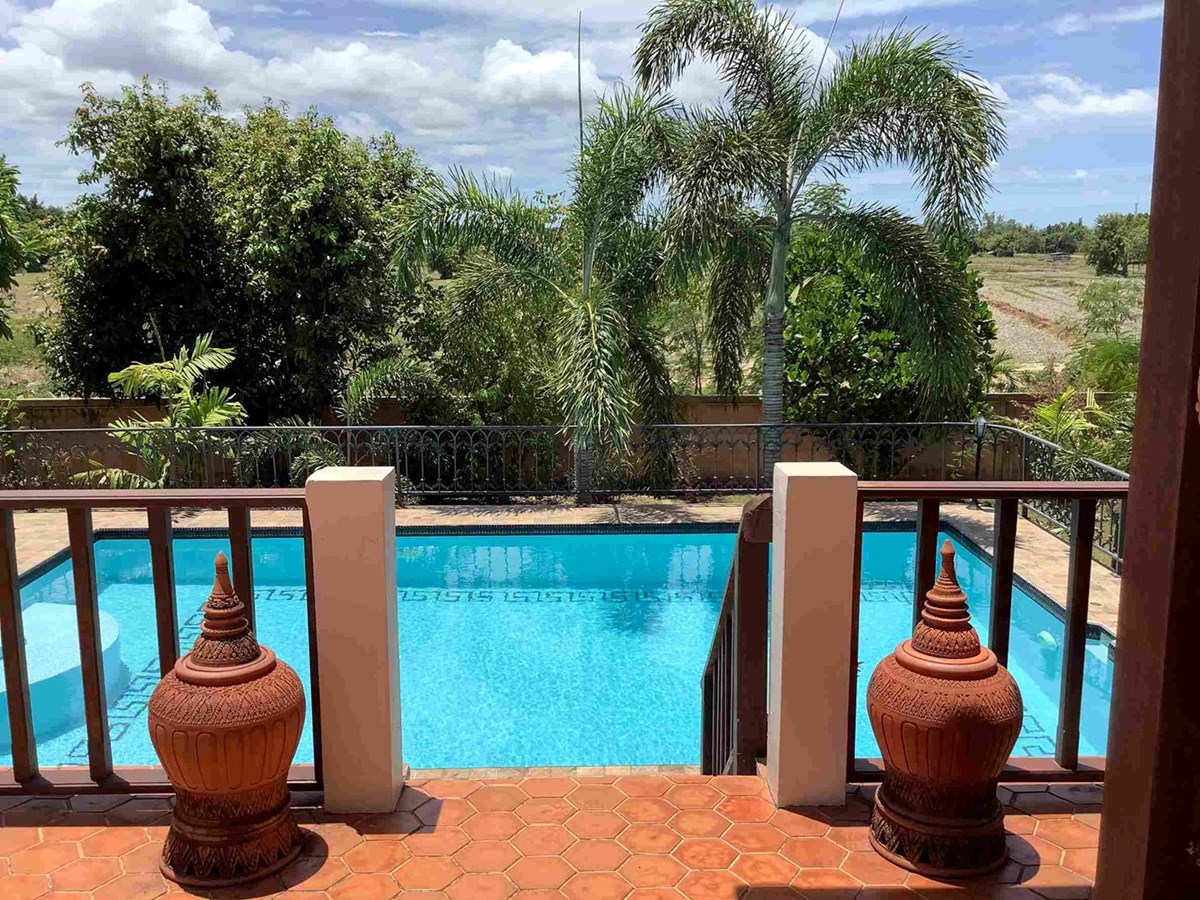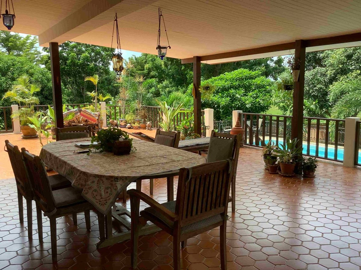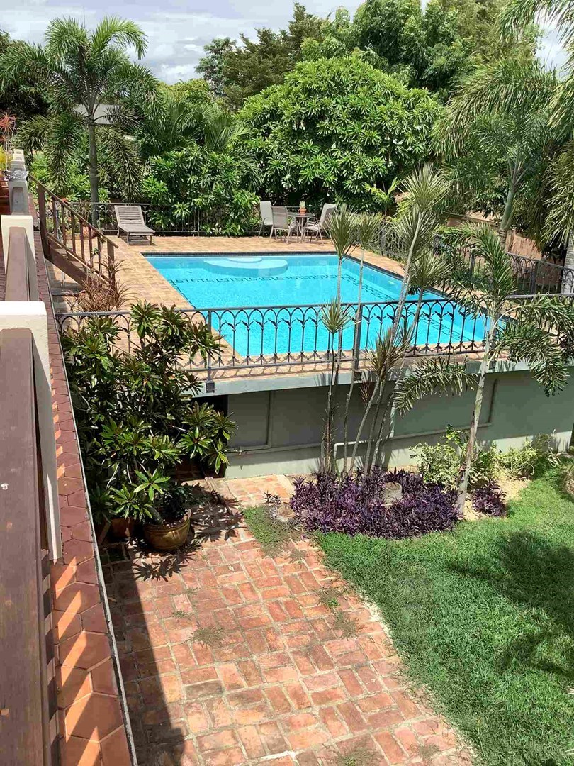 A modern home with thai design aspects incorporated throughout. 3 bedrooms, 4 bathrooms, dining room, beautiful terrace with nice tropical garden, large living space and European-style kitchen, Living area 465 sq.m, land size 589 sq.w (2356 sq.m), large swiming pool with beautifully landscaped garden. The house itself is well decorated.