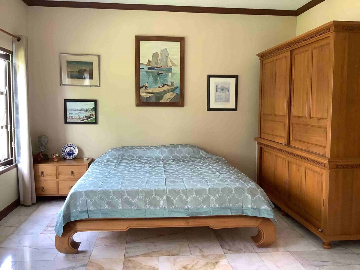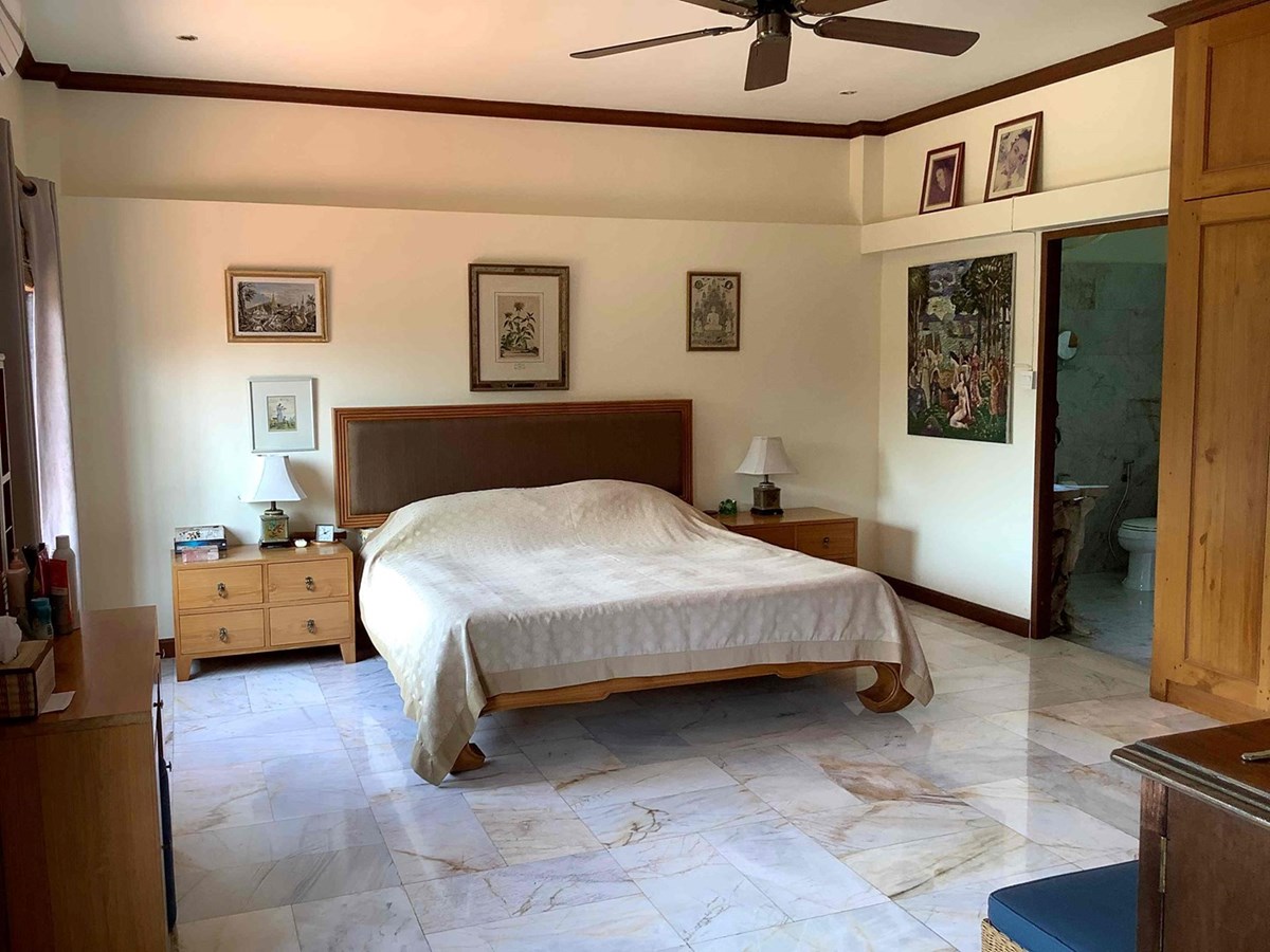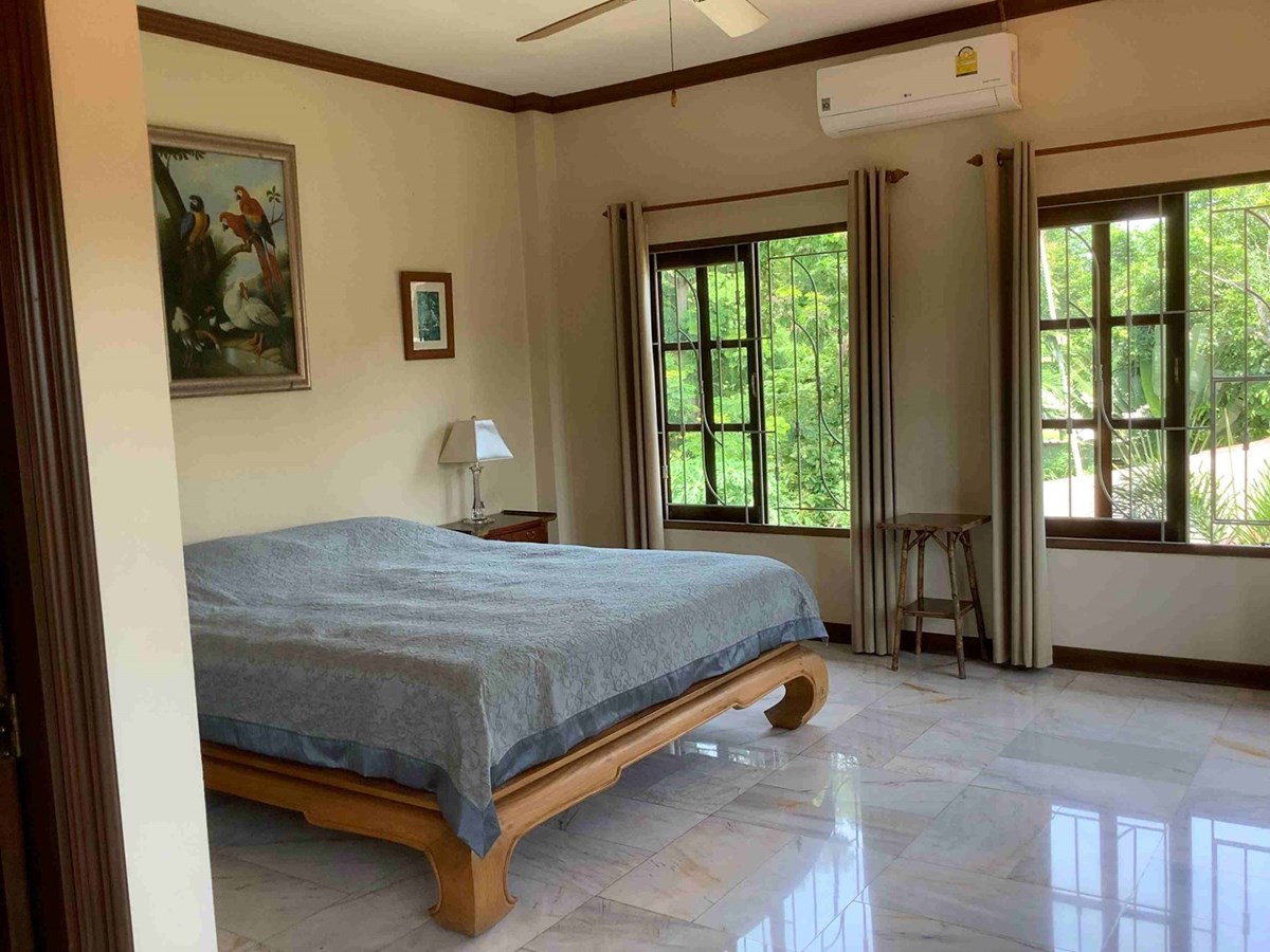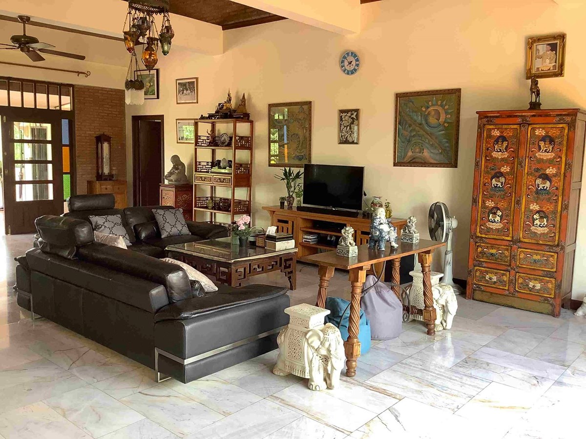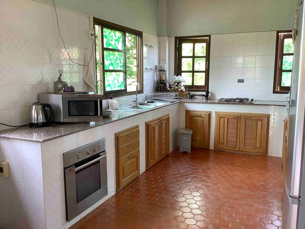 A modern home with thai design aspects incorporated throughout. 3 bedrooms, 4 bathrooms, dining room, beautiful terrace with nice tropical garden, large living space and European-style kitchen, Living area 465 sq.m, land size 589 sq.w (2356 sq.m), large swiming pool with beautifully landscaped garden. The house itself is well decorated.