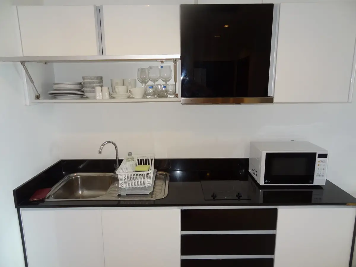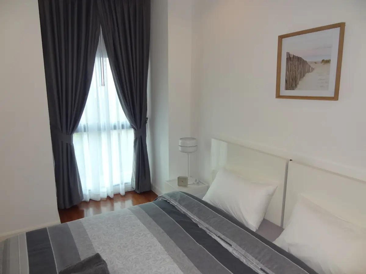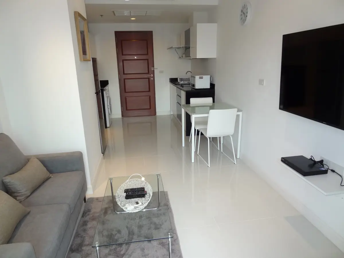 Single bed and single bathroom Axis Condominium condo for sale & rent. Partial ocean can be seen peeking out above a spectacular city view from the balcony. Features of the 44 Sqm flat include a Large woodfloored bedroom, easy-to-use modern european kitchen, living and dining space and balcony.