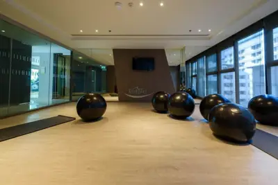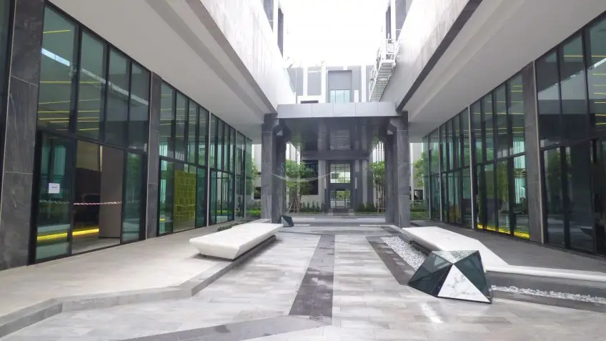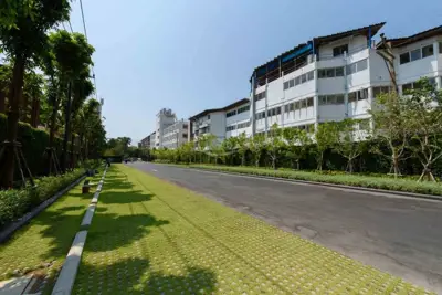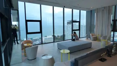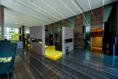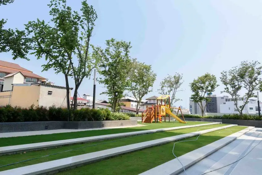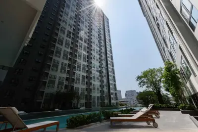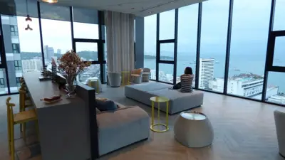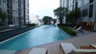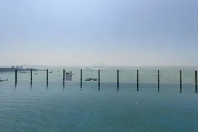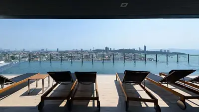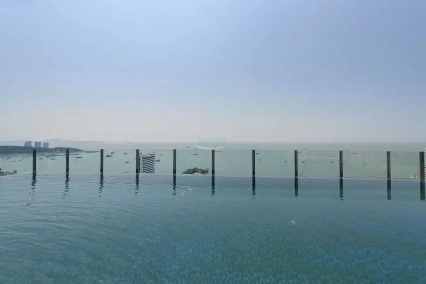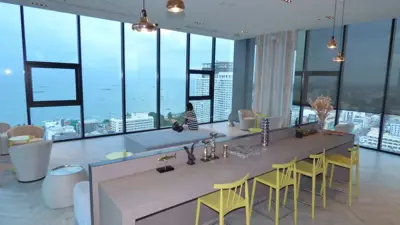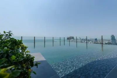 The building offers resort amenities and open lobbies, creating a peaceful oasis in the heart of Central Pattaya. Amenities include swimming pools (lap infinity pool on the rooftop, 5th-floor pool next to the fitness center, and a kids pool), fitness center, yoga room, kids toy playroom, rooftop gardens, 360-degree panoramic viewing deck, night lounge, basketball court, kids park, garden terrace, and large open grounds ideal for jogging. There is free high-speed WiFi in common areas, 24/7 security guards, and CCTV.