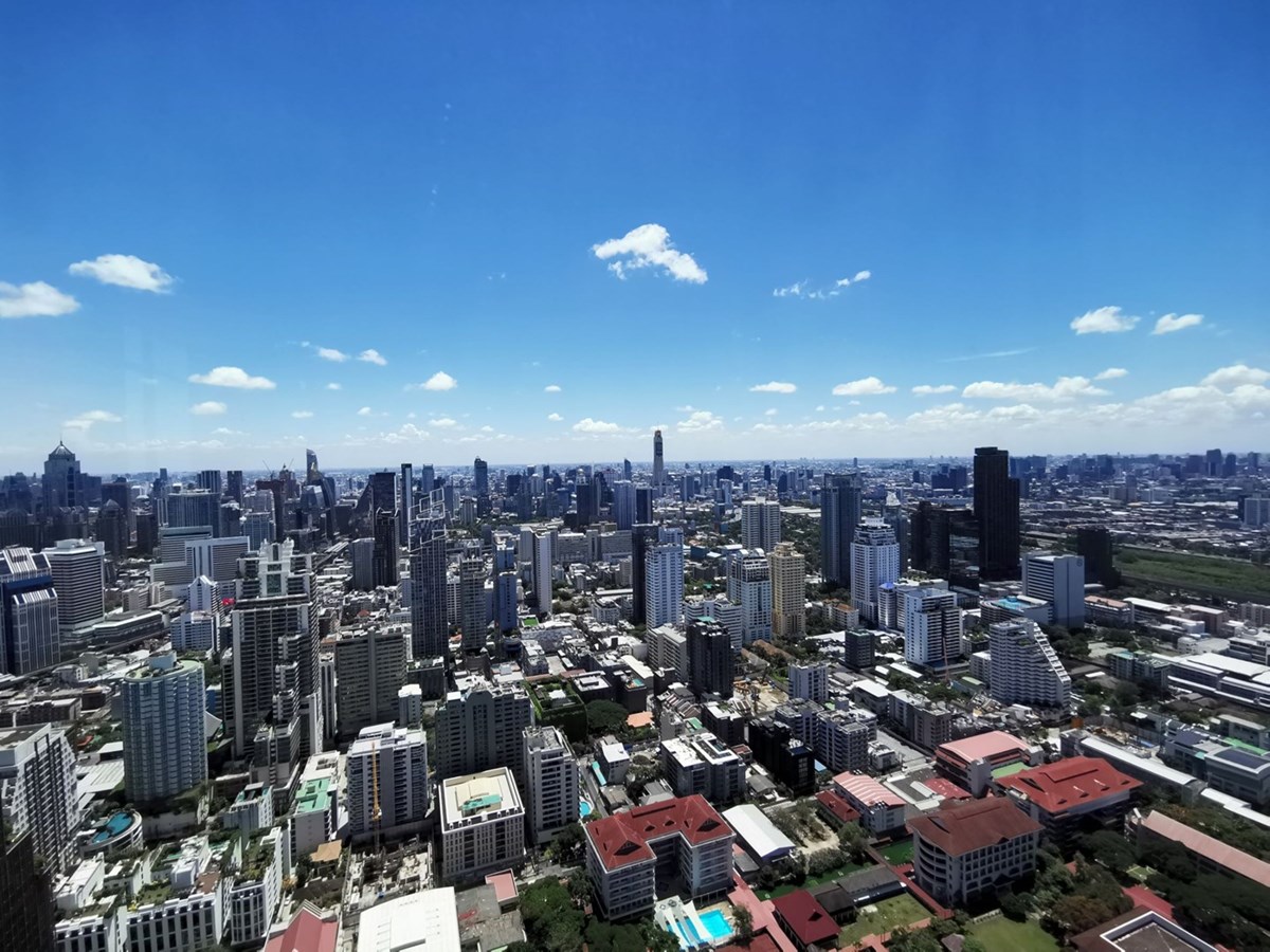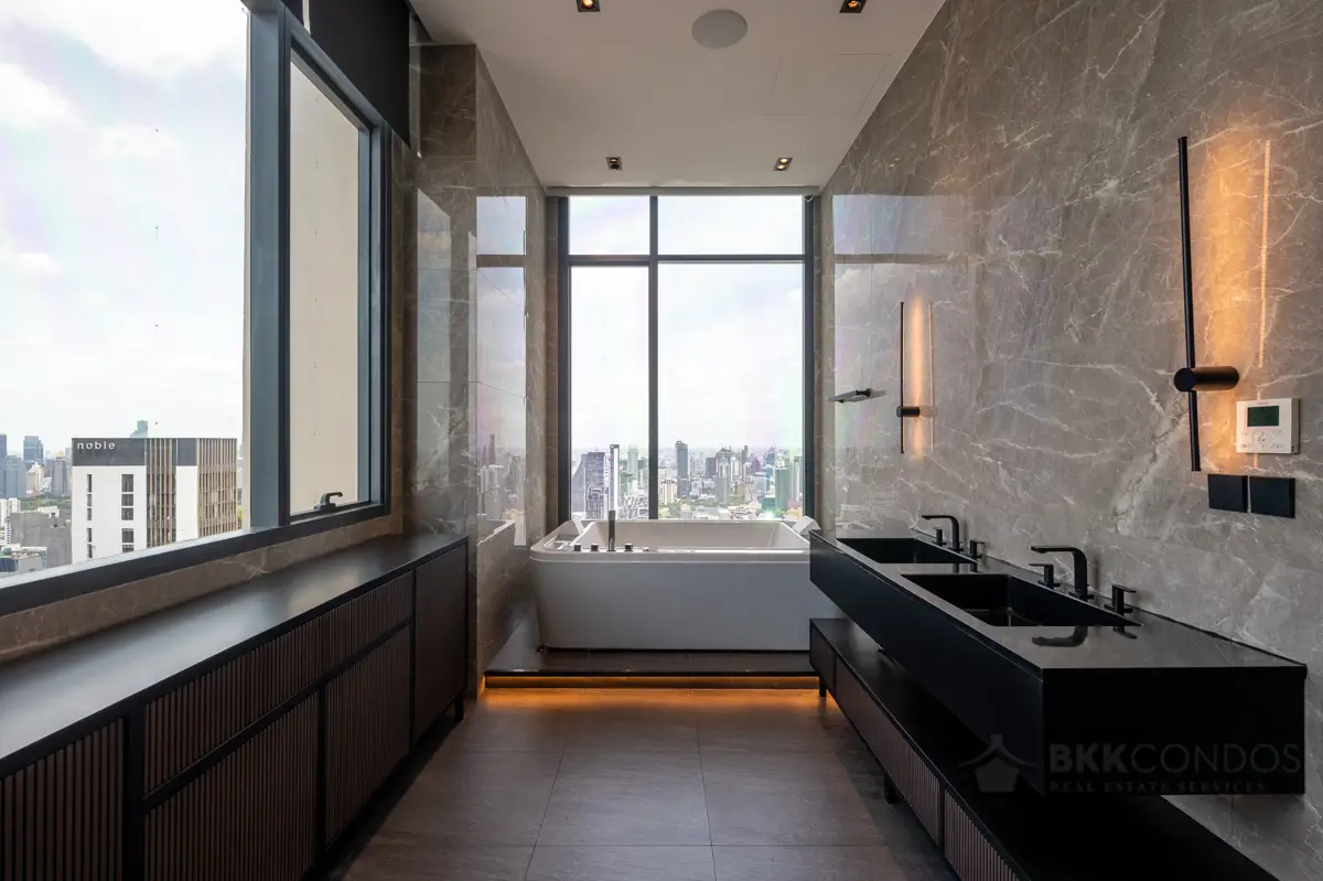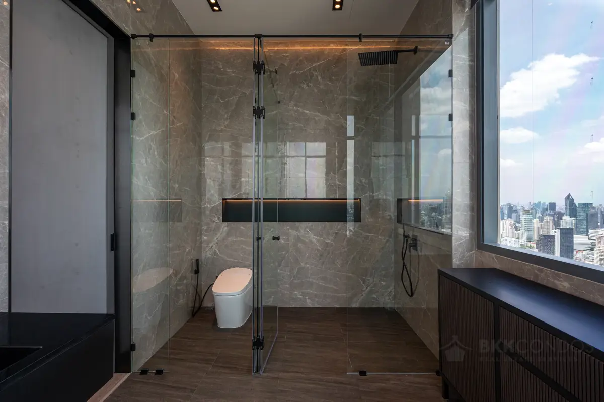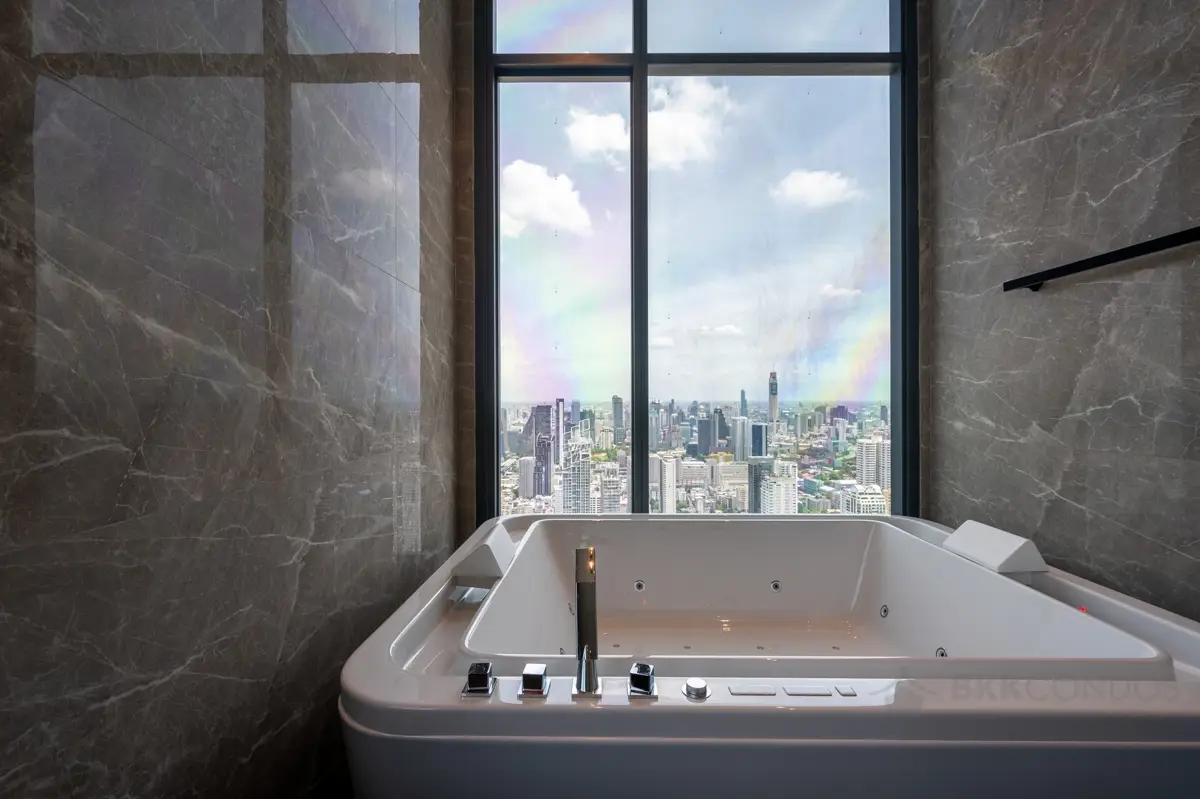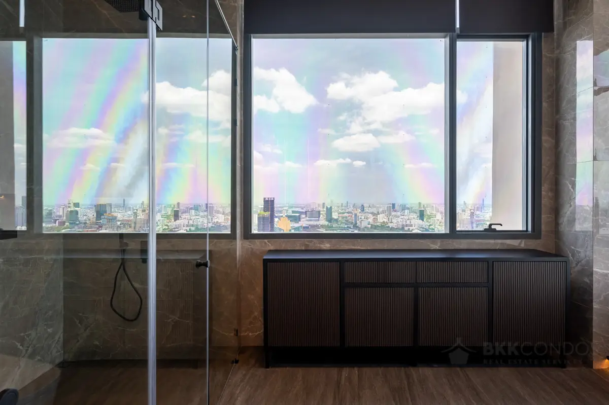 On the market for sale and available to rent is this rare penthouse condo at The Esse Asoke (Singha Estate) on Sukhumvit 21. The stylish property has 2 bedrooms, 3 bathrooms, kitchen and living and dining area with a superb view over Bangkok. This property interior measures a comfortable 133.92 sqm, has high ceilings and is situated on the 51st floor facing South and West with stunning unobstructed views of the surrounding area of central Bangkok. There are 2 fixed car park spaces on the Title Deed (12 sqm.+12 sqm.).