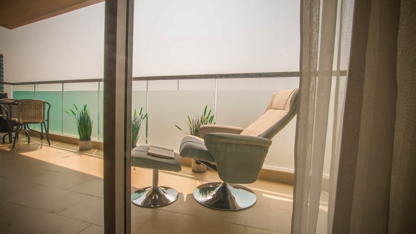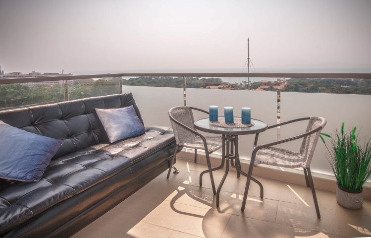 The apartment has a large balcony with panoramic sea views, equipped with a sofa bed and a table.
