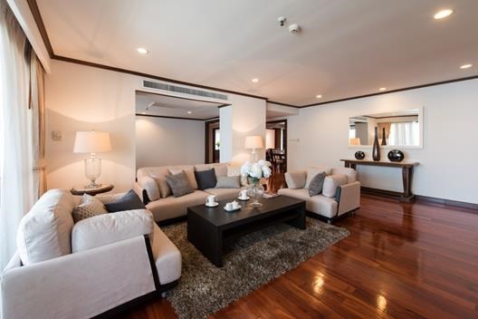 This elegant four bedroom apartment has been designed to cater for the needs of a Business Executive with large family size. Comfort is distinctly represented in every detail, from custom-designed furniture to the elegant interior lighting and dark Teakwood floors contrasted by the lighter furniture and marble colors. This unit offers a spacious 260 square meters in space, featuring four bedrooms, three bathrooms, study room, living room, dining room, full size kitchen, full size balcony, laundry area, storage room, and two entrances, Maid's living quarter with maid's bathroom, all fully furnished premium furnishings and superior amenities.