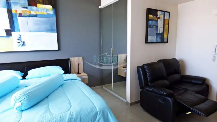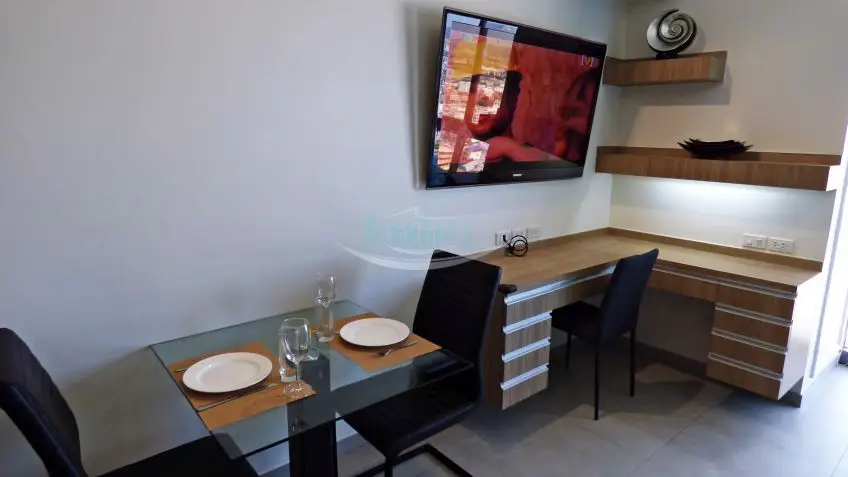 Positioned high on floor 27, facing North, this cleverly designed and furnished studio unit offers spectacular views of Pattaya City and Pattaya Bay. Inside, it continues the building's modern theme with a designer-fitted kitchen, built-in wardrobes and cabinets, a chic bathroom, ceramic flooring, a ceiling fan, and air conditioning. A large wall-mounted LED TV with cable TV service and a fast fiber optic internet connection are also included in the rental fee.