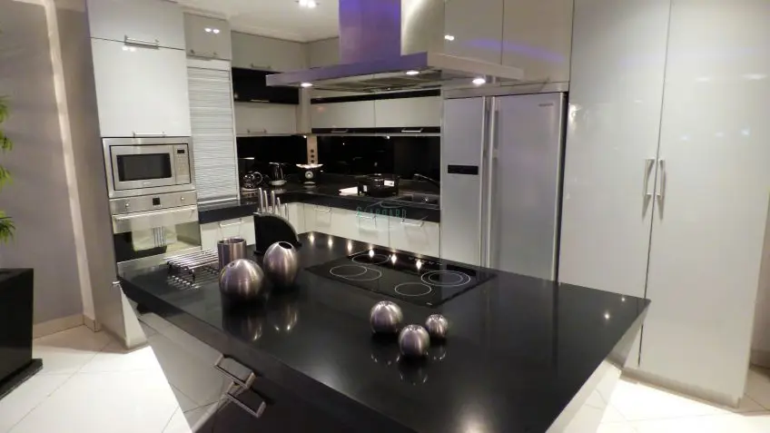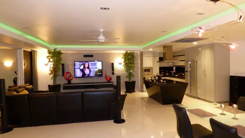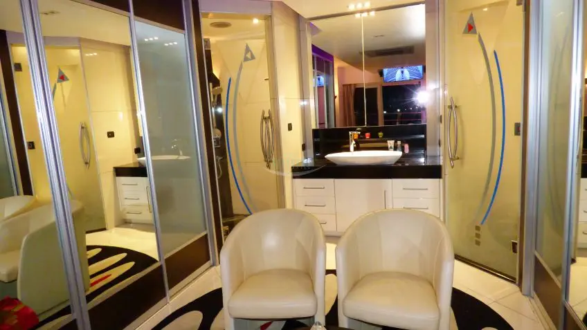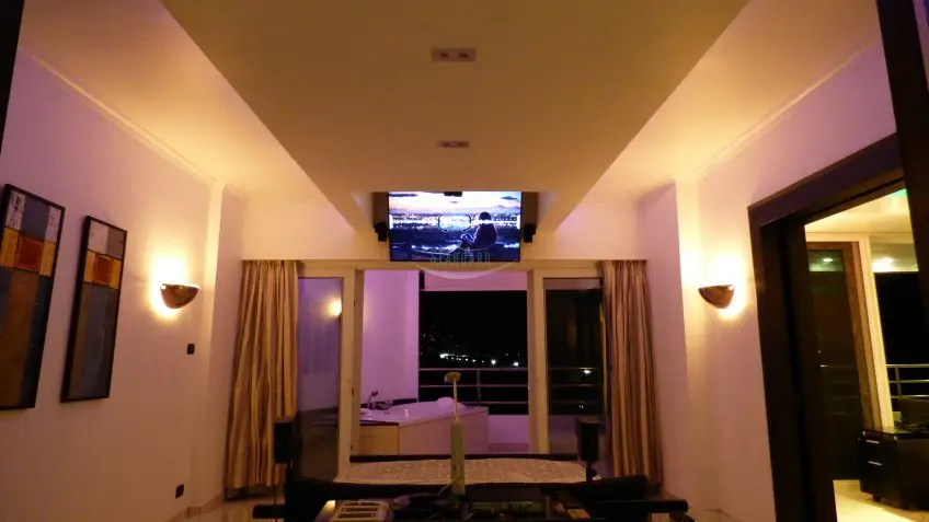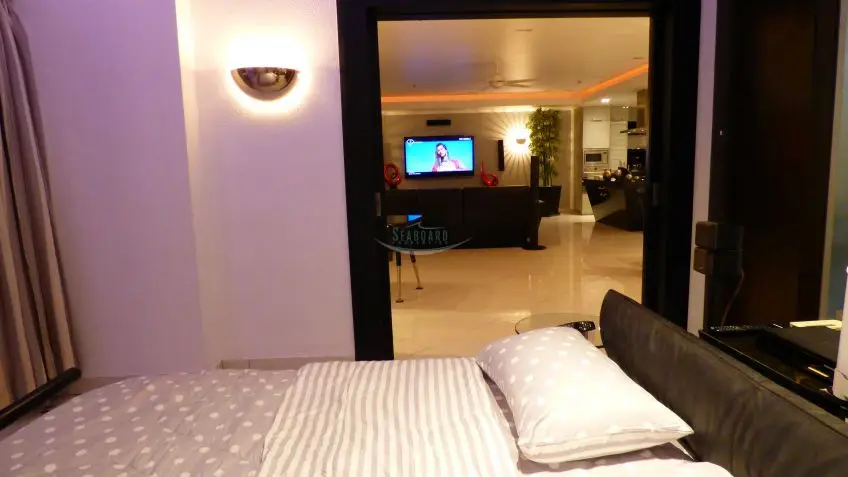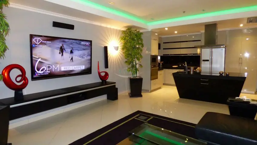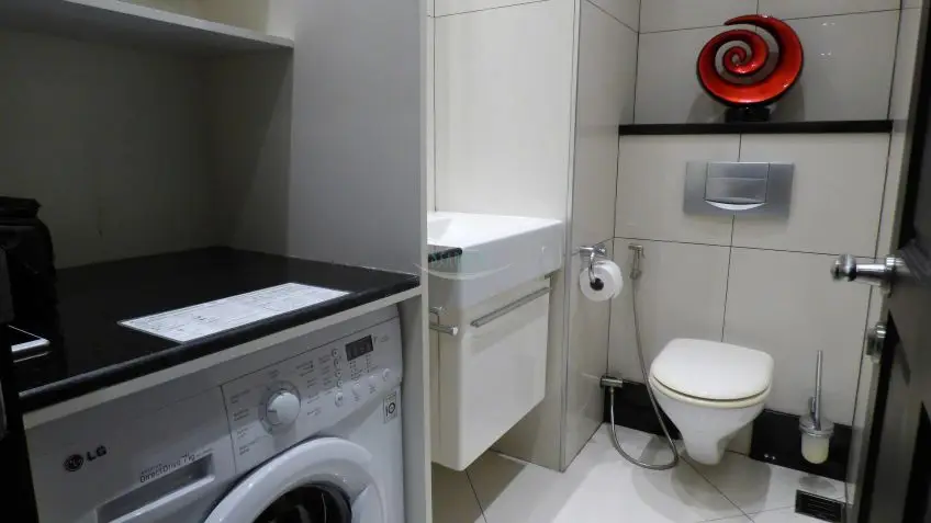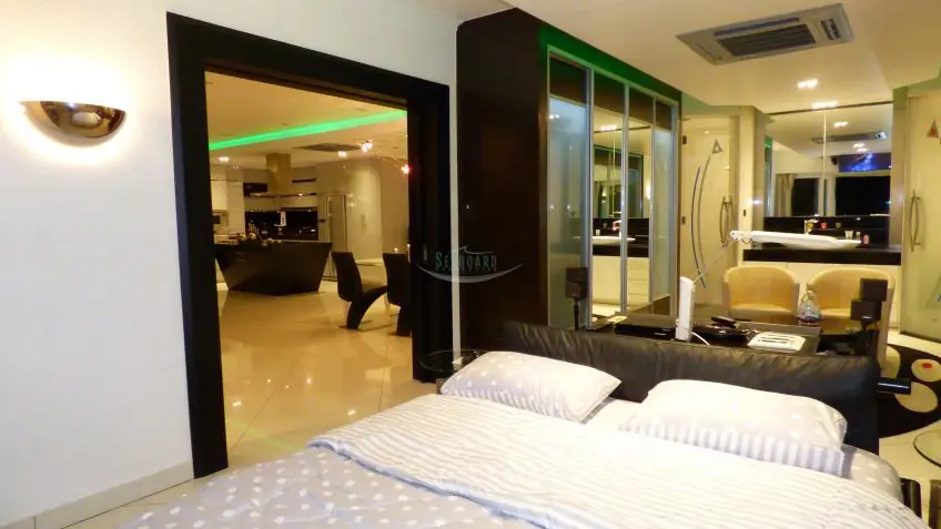 A genuine Dongtan Beachfront Condominium presents a stylish one-bedroom condominium with a spacious curved balcony and stunning sea views. This modern apartment boasts an open-concept bedroom and bathroom with meticulous attention to detail, making it one of the finest one-bedroom condos. The furniture is high-end, and the kitchen is fully equipped with Siemens appliances, including a dishwasher. The condo comes with two LED TVs (70" in the living room and 55" in the bedroom), a washing machine in the guest toilet, and a large Jacuzzi for two in the unique open-concept bedroom/bathroom. Both rooms and balconies feature concealed multi-color LED ambient lighting in the ceiling. The peaceful apartment features energy-efficient Daikin air conditioning systems and UPVC windows with double-glazed thermal insulation.