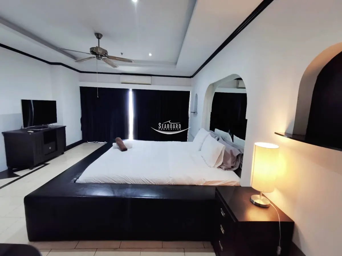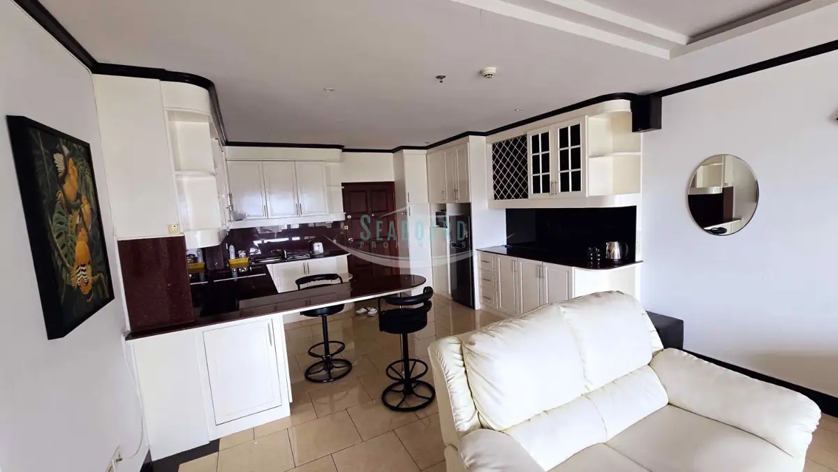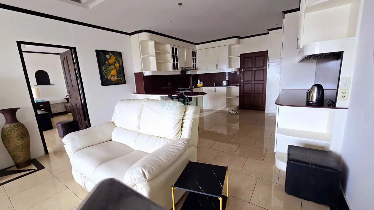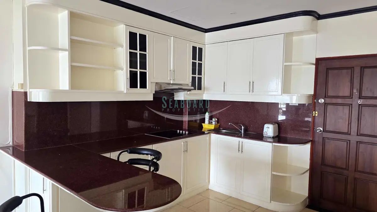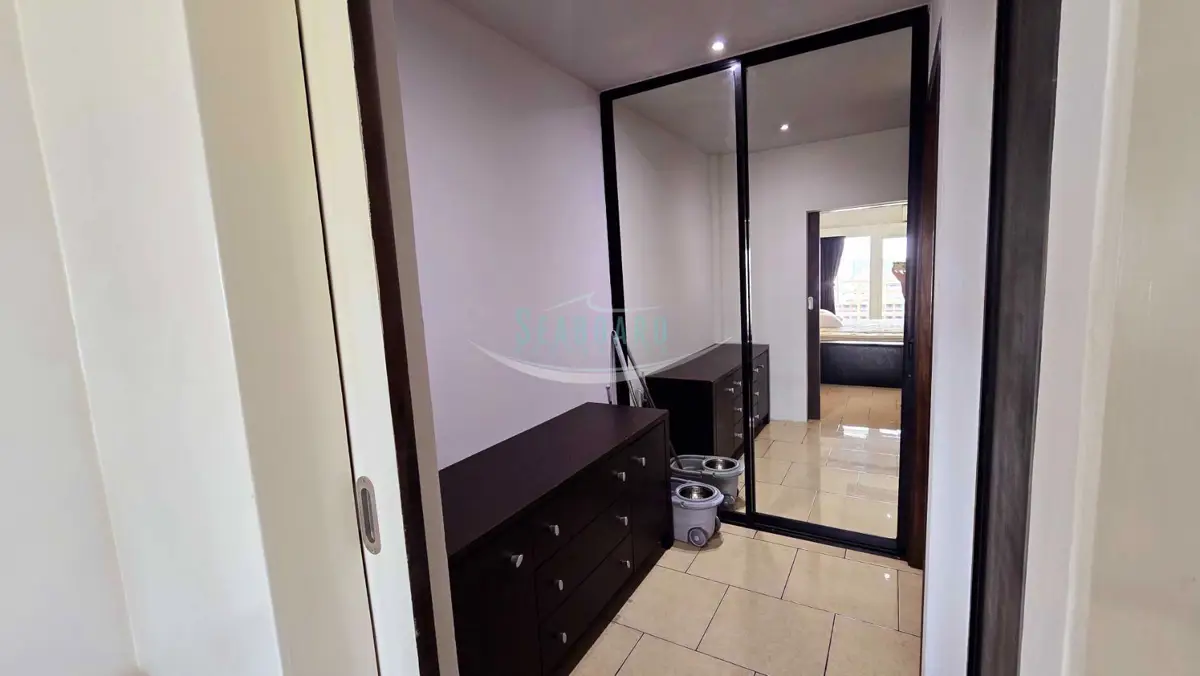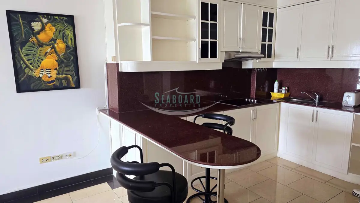 A modern one-bedroom apartment with two large balconies to the walking street Side of the building and comprises a spacious living area with a fully fitted European kitchen, bathroom with full tiling, separate bedroom, and storage room. balcony looks out to the sea. The apartment is offered for rent fully furnished and with full A/C, a Mega king-size bed, and a smart TV inside the bedroom. New washing machine and refrigerator.