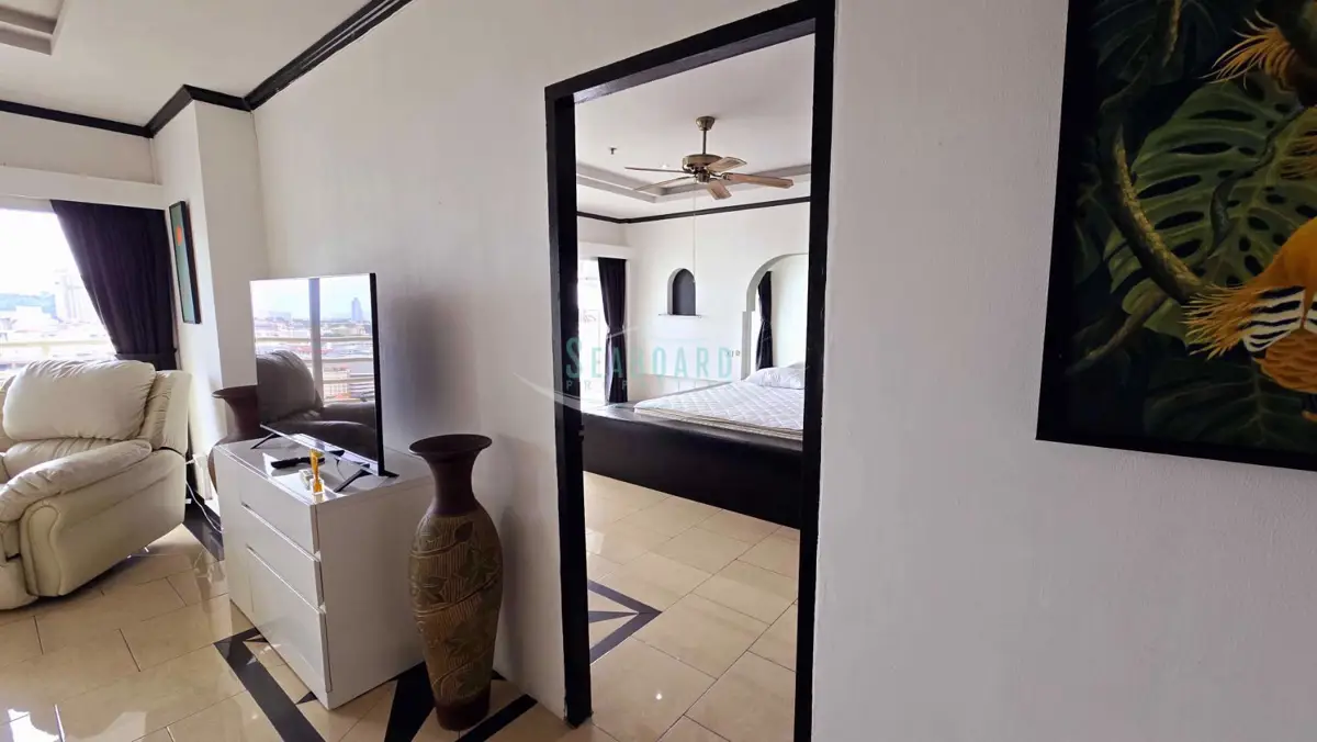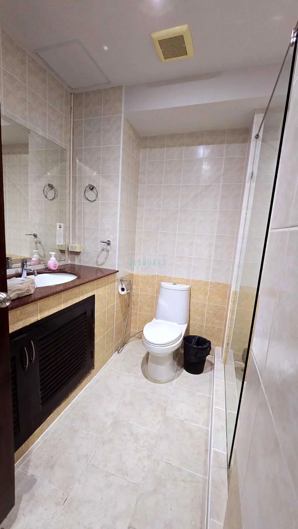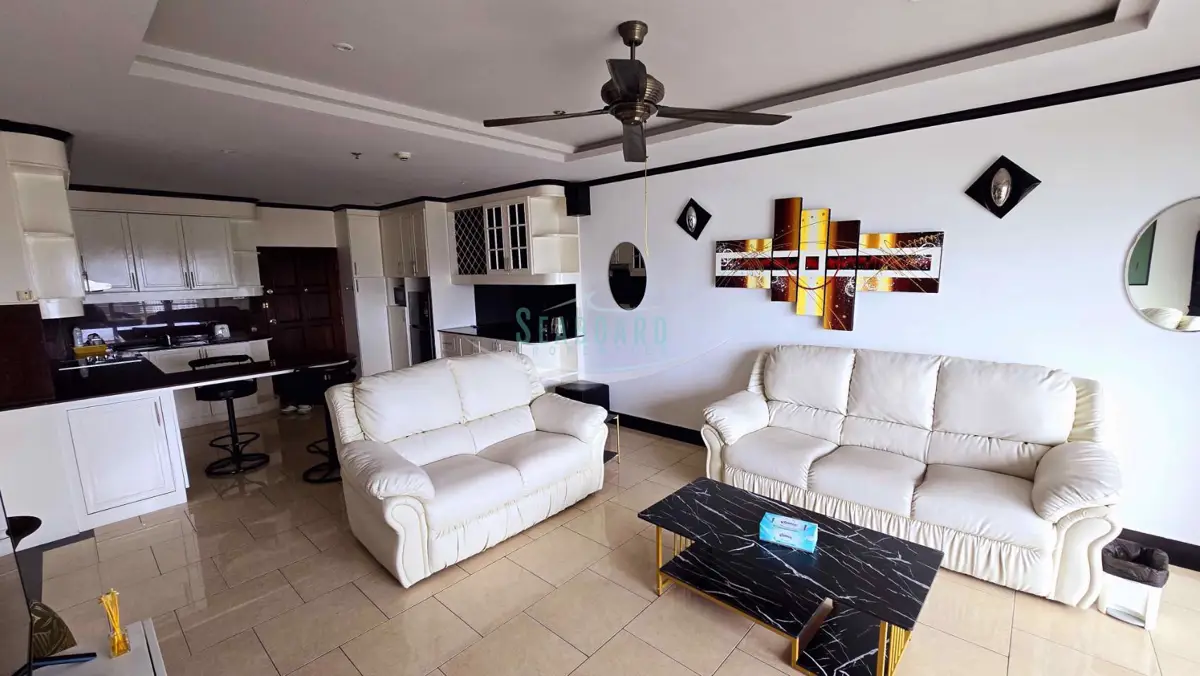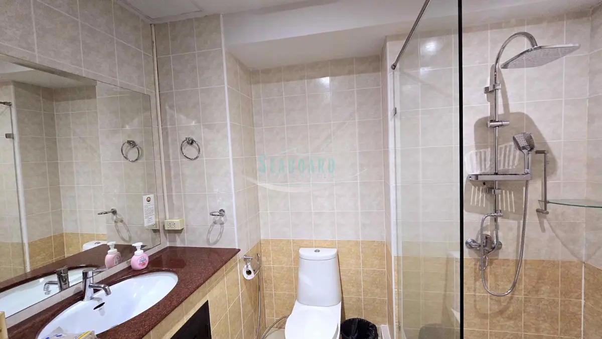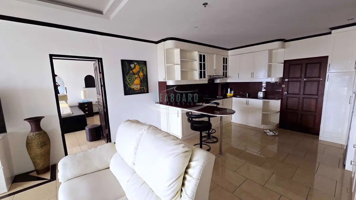 A modern one-bedroom apartment with two large balconies to the walking street Side of the building and comprises a spacious living area with a fully fitted European kitchen, bathroom with full tiling, separate bedroom, and storage room. balcony looks out to the sea. The apartment is offered for rent fully furnished and with full A/C, a Mega king-size bed, and a smart TV inside the bedroom. New washing machine and refrigerator.
