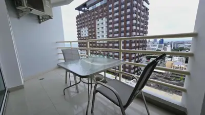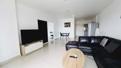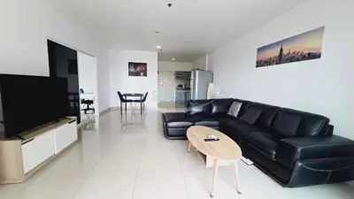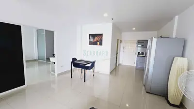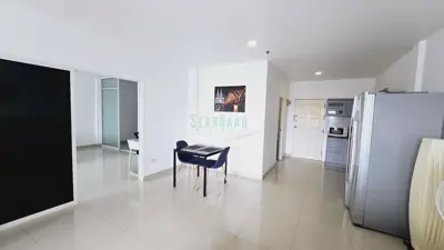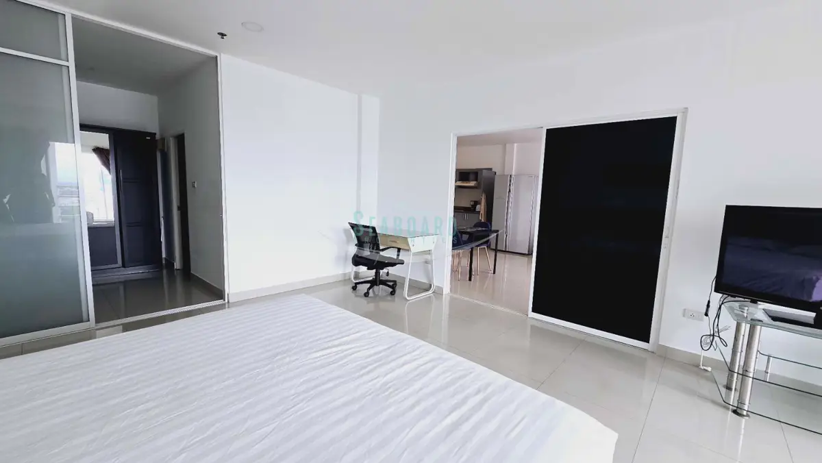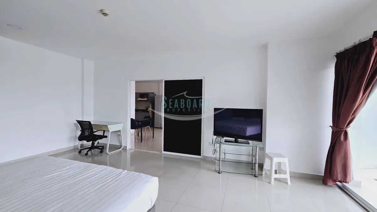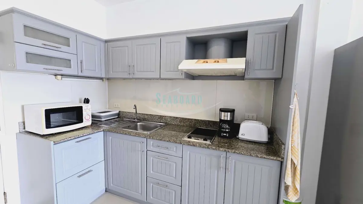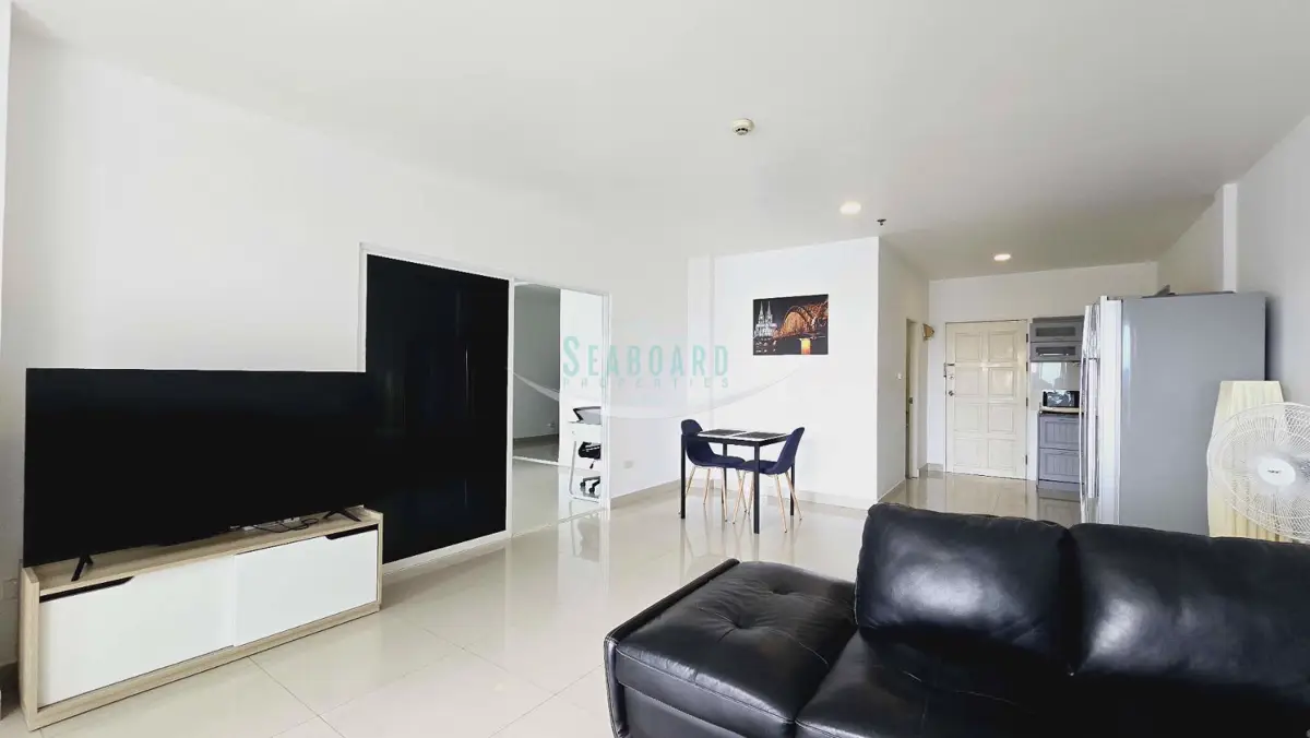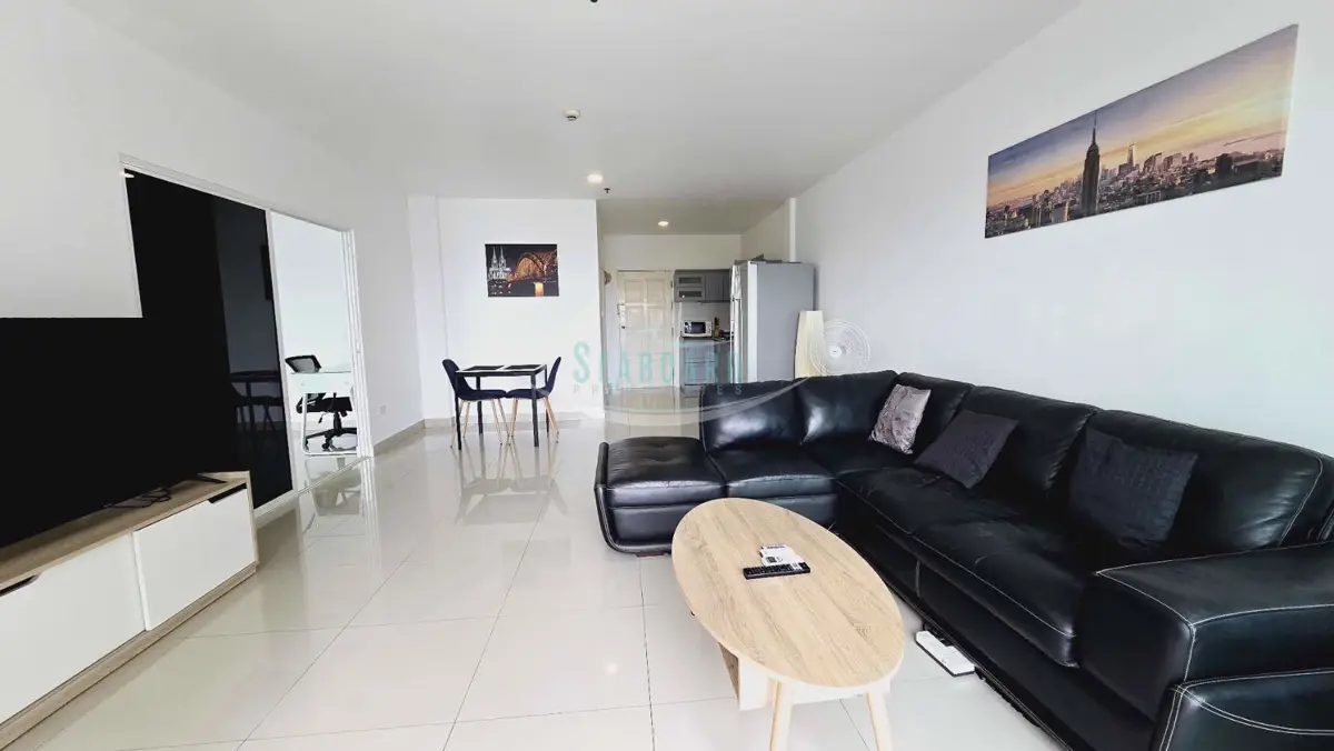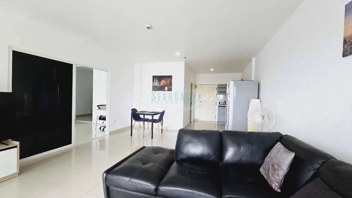 A modern one-bedroom apartment with a large balcony to the Naklue Side of the building comprises a spacious living area with a fully fitted European kitchen, a modern bathroom with full tiling, a separate bedroom with a separate balcony, and sea and city views.