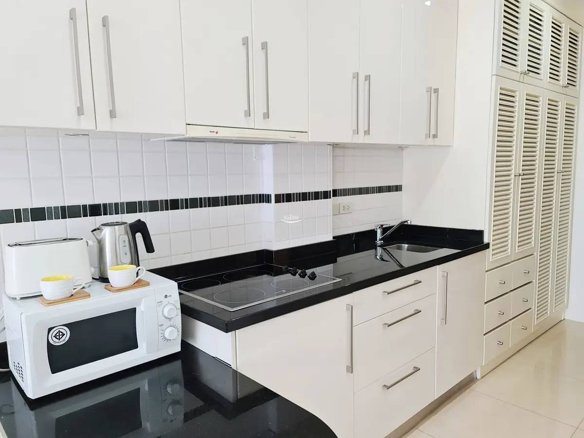 it gives a bright and airy feel to the unit. Fully furnished and boasting a European kitchen, the condo is ready for you to move into.