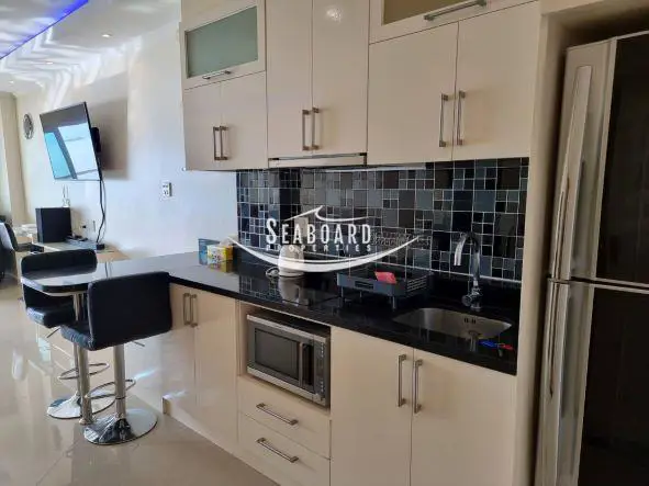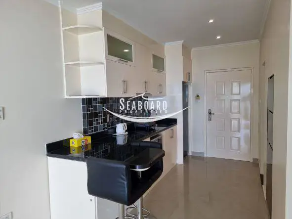 The apartment is fully furnished and has a fitted kitchen, air conditioning, and a beautiful view over Jomtien Beach.