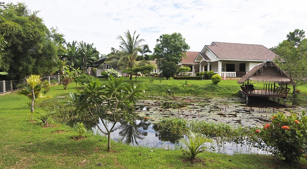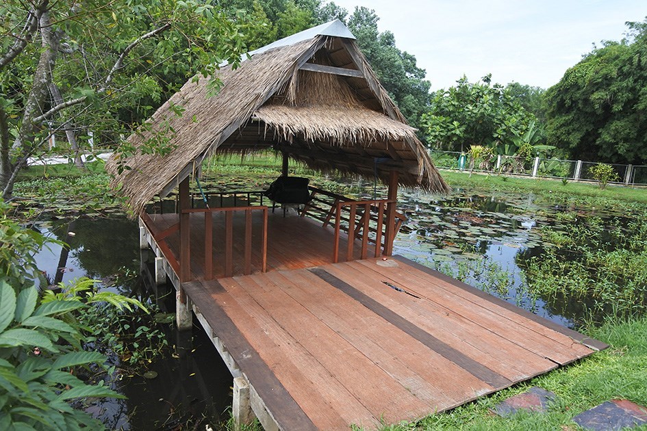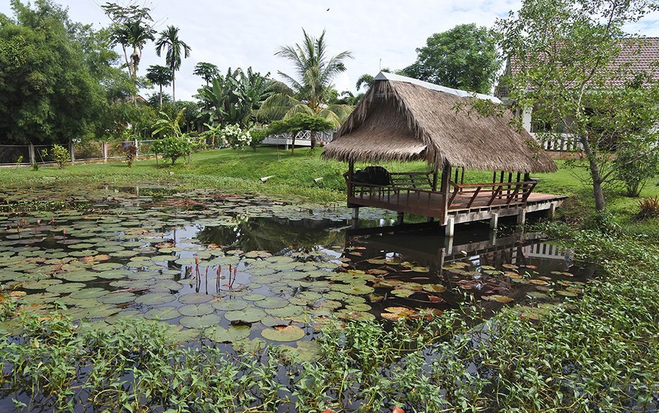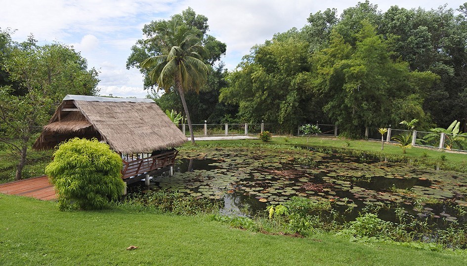 The pond, filled with Lotus flowers and fish, has a jetty with thatched roof and benches for relaxing discussions
