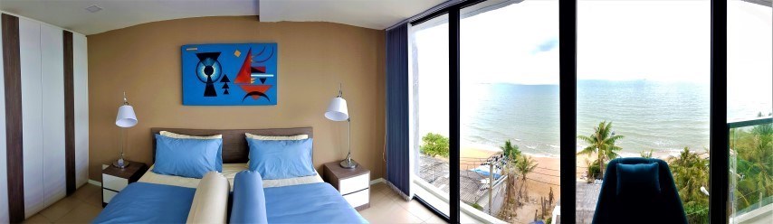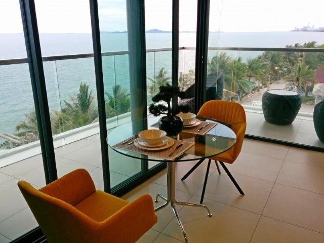 Absolute beachfront on floor 6th, corner unit, foreign name, fully furnished with high quality furnishing, never been occupied. 1 bedroom, 1 bathroom, living area 68.7 Sqm, located at Na Jomtien Beach, close to minimart and restaurant, 24 hour security,finess room, roof top swimming pool.
