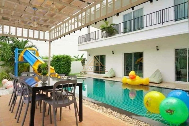 บ้านพูลวิลล่าส่วนตัวสำหรับเช่าและขาย บ้านนี้มี 6 ห้องนอน 5 ห้องน้ำพร้อมอ่างอาบน้ำ ครัวยุโรป เฟอร์นิเจอร์ครบ พื้นที่ใช้สอย 600 ตรม. สวน โต๊ะพูล
