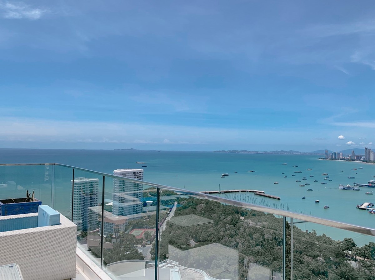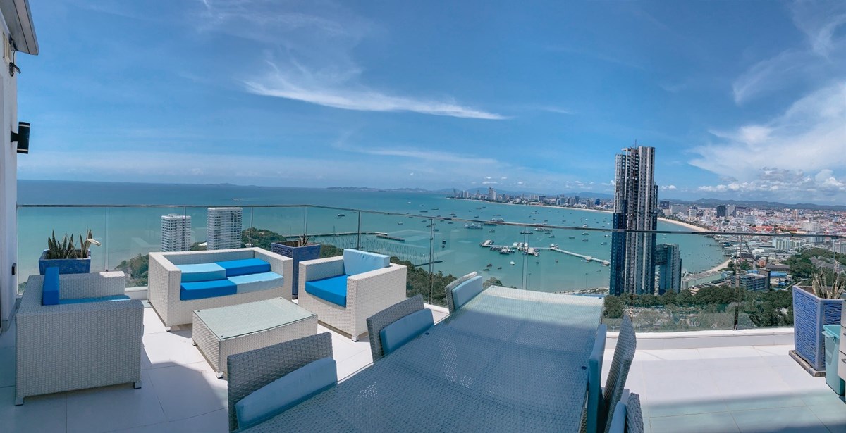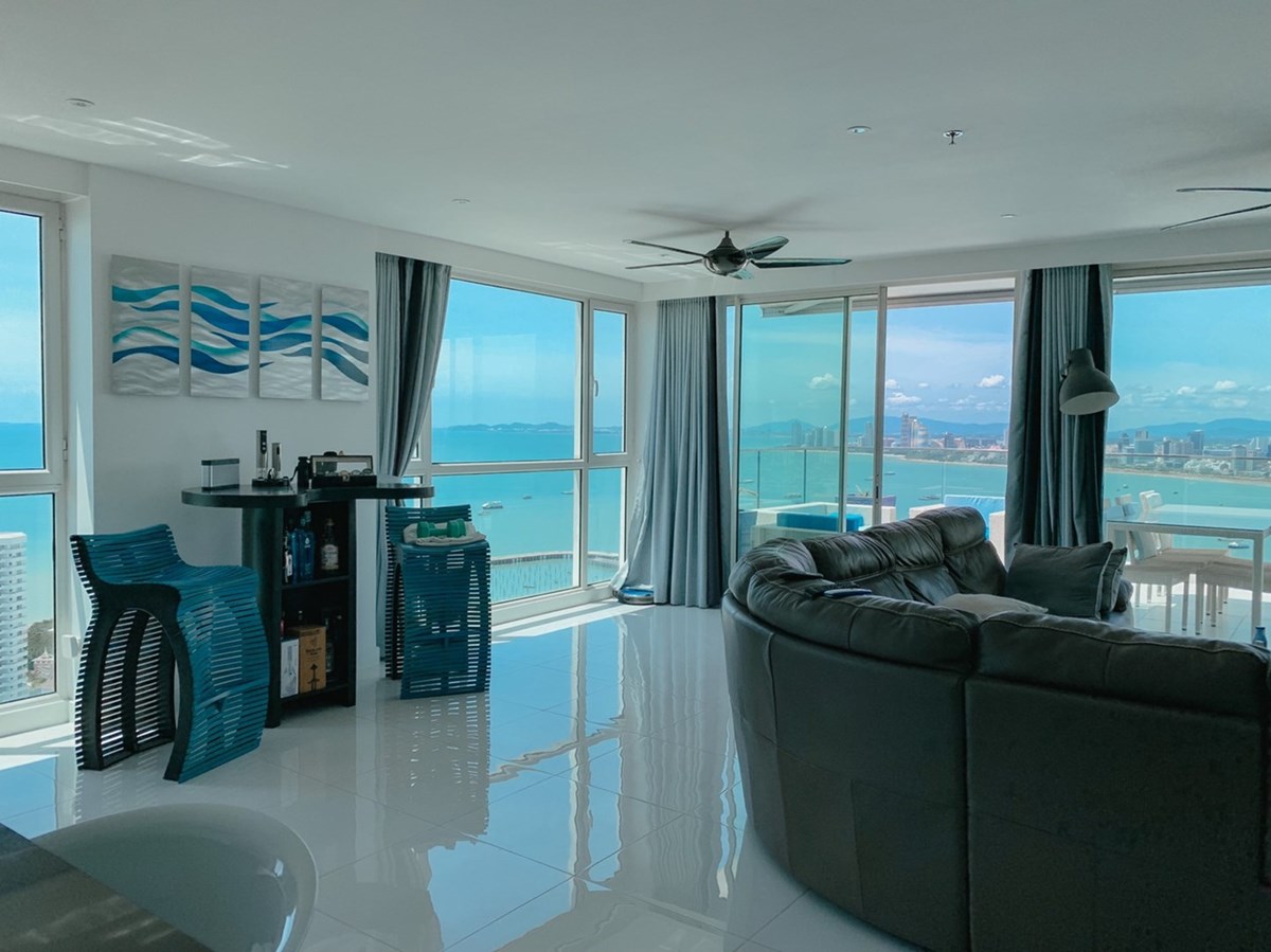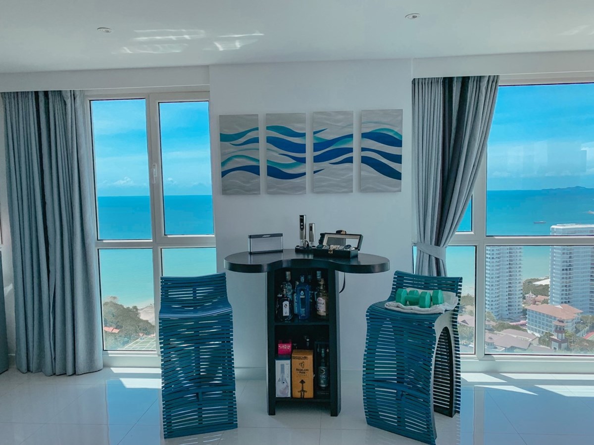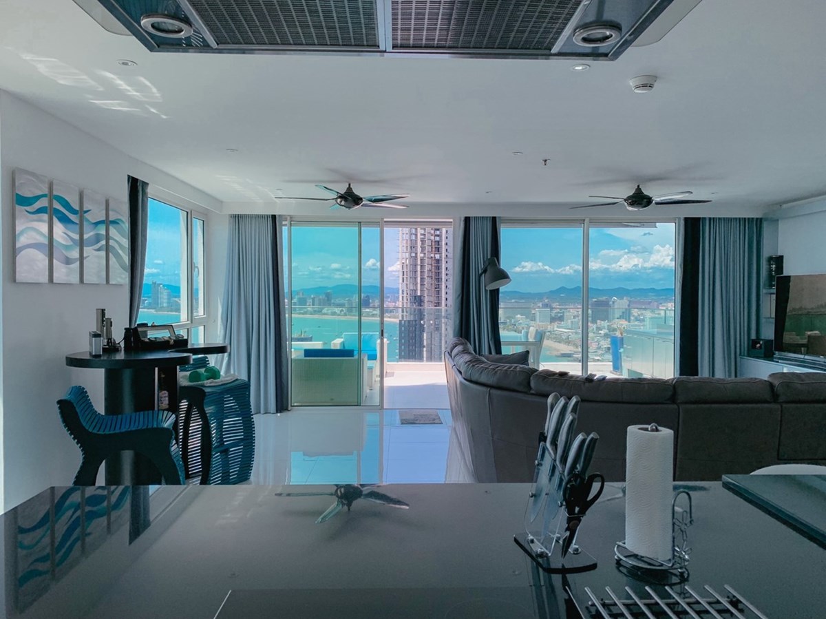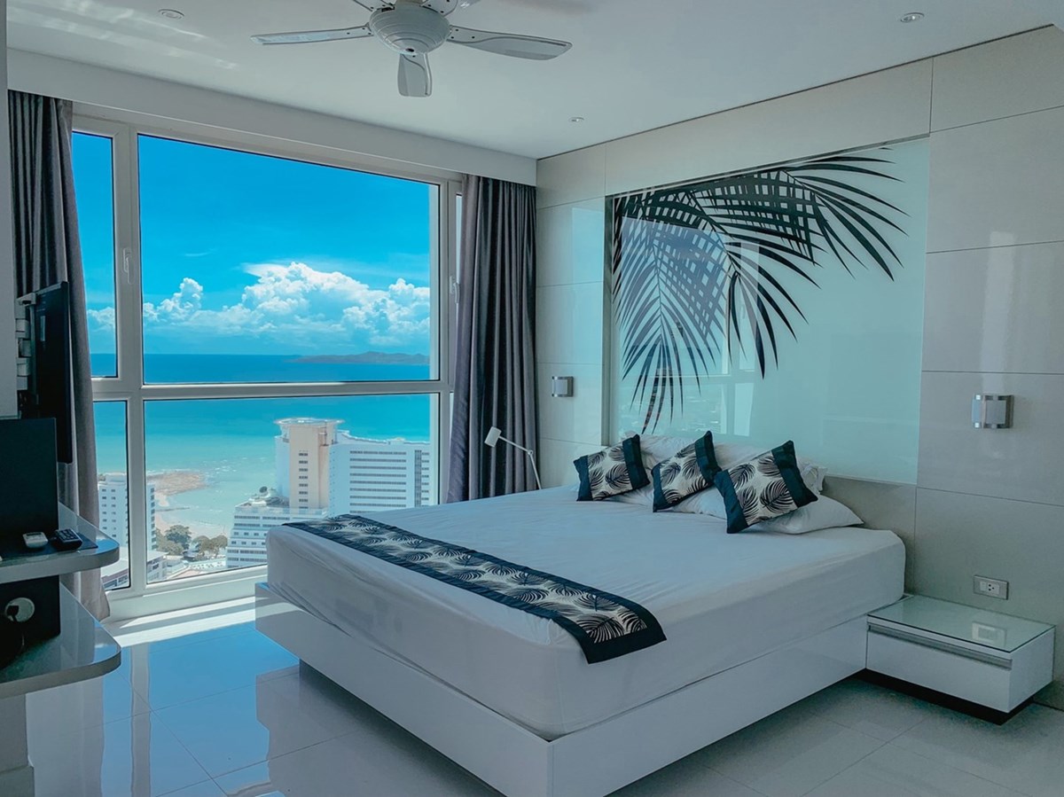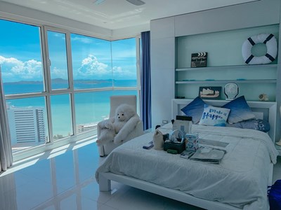 ห้องหัวมุมที่งดงามพร้อมระเบียงดาดฟ้าและระเบียง 2 แห่ง มี 3 ห้องนอน 3 ห้องน้ำ ห้องนอนและห้องน้ำทุกห้องมีวิวตระการตาเหนืออ่าวพัทยา จอมเทียน เกาะล้าน...