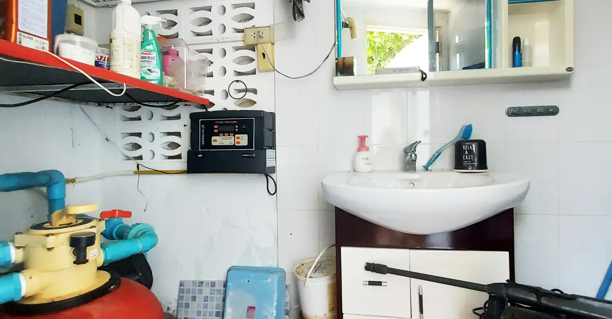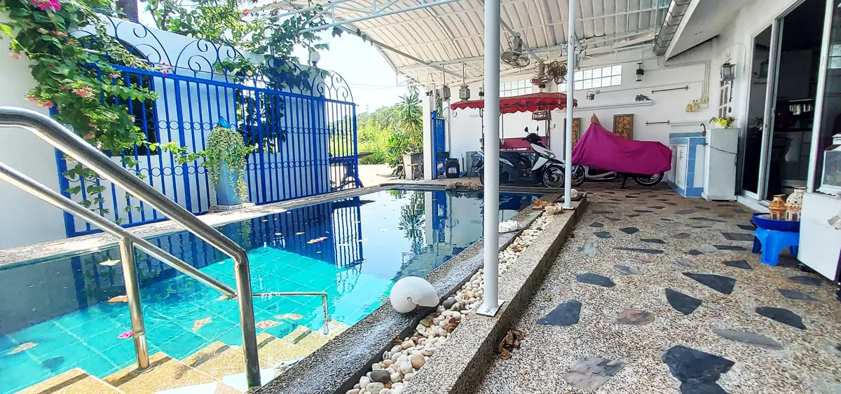 ส่วนด้านนอกประกอบด้วยระเบียงพร้อมสระว่ายน้ำทั้งหมด มีห้องน้ำและห้องเครื่องสำหรับสระว่ายน้ำรวม และห้องครัวกลางแจ้ง ส่วนด้านนอกนี้มีหลังคาคลุมเป็นส่วนใหญ่